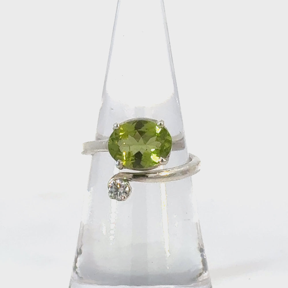 This dazzling US size 6 ring in Sterling Silver showcases two gems, one oval cut Peridot and one Cubic Zirconia gem.