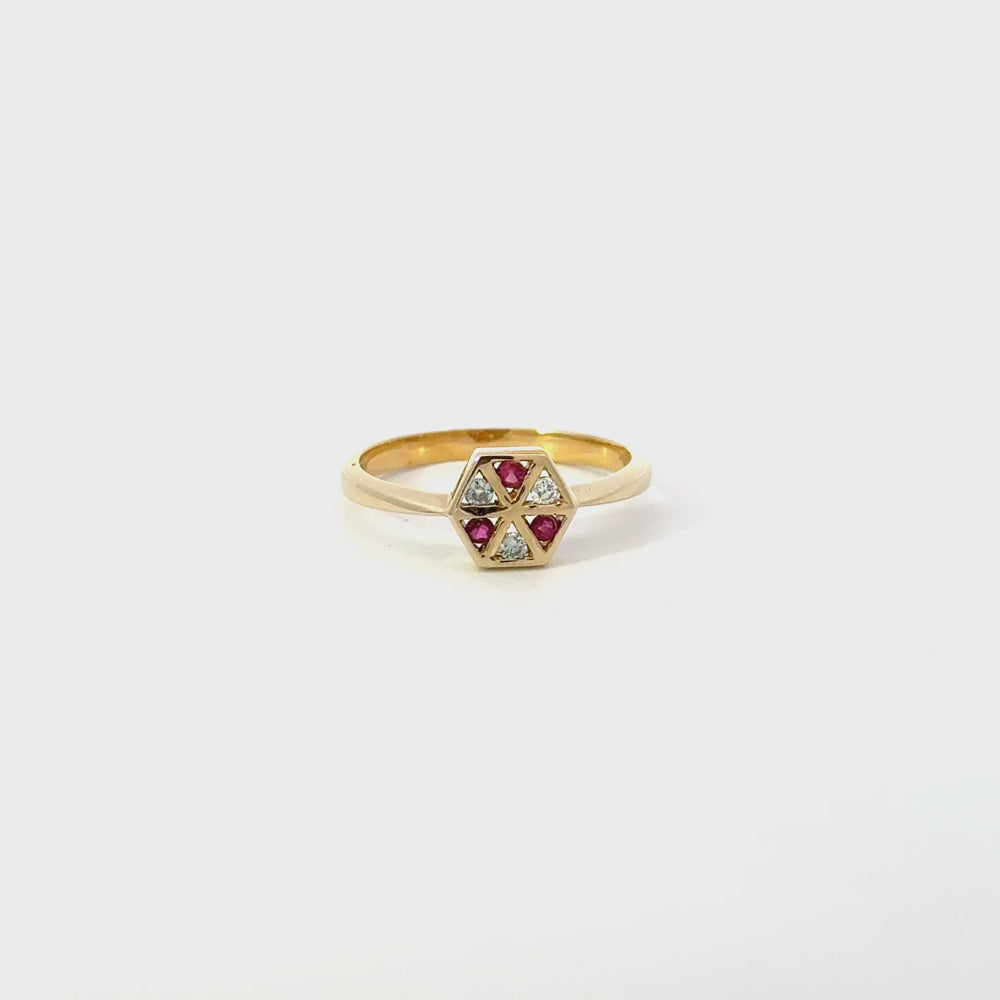 Vintage Ruby & Diamond Hexagon Ring in 14K Yellow Gold