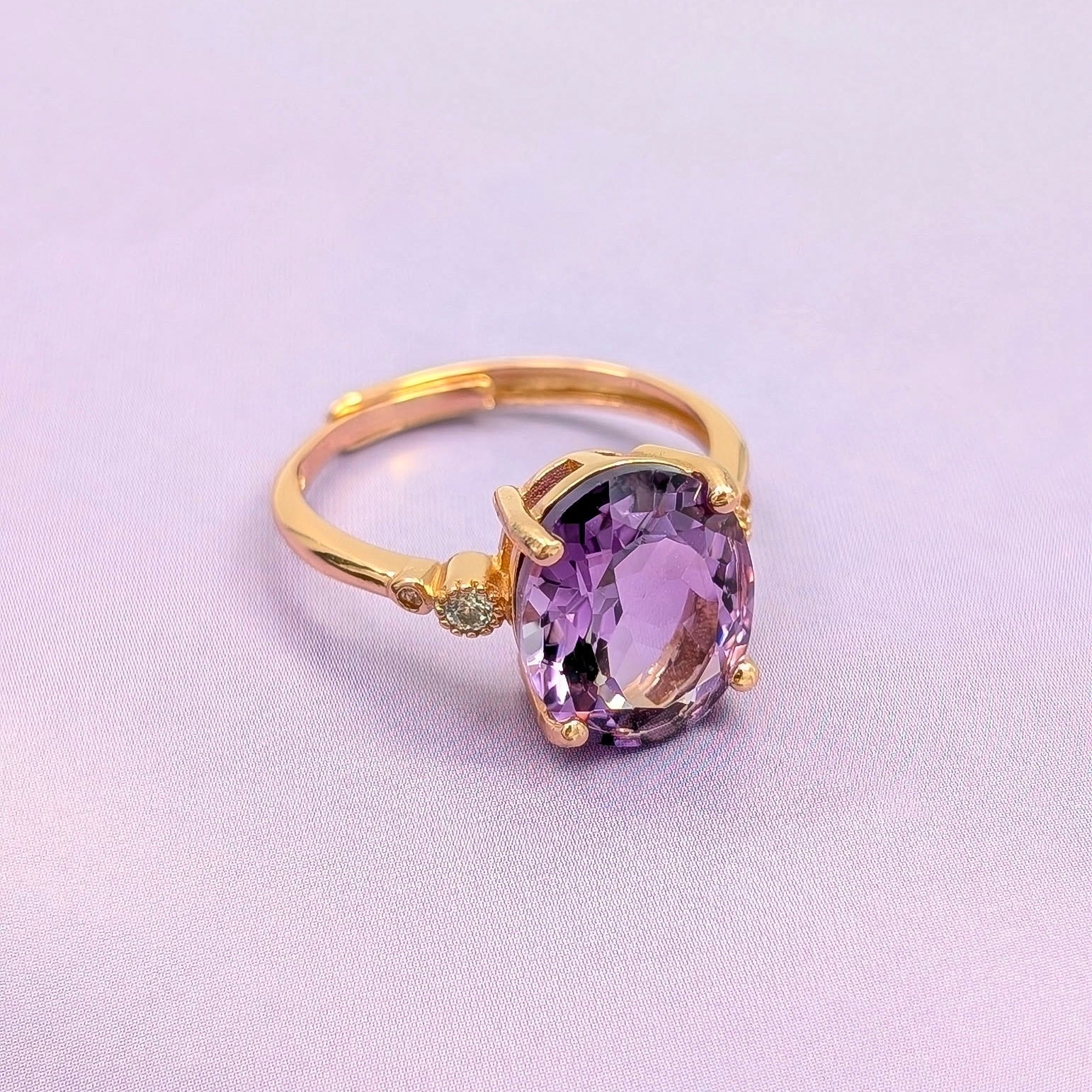 This Amethyst ring features a vivid oval cut Amethyst set in polished Rose Gold over Sterling Silver. The center stone is secured in a classic four prong setting that highlights its faceting and soft purple hue, and is framed on both sides by petite round White Zircon accents for added sparkle. Designed with a gently adjustable band, this ring offers a comfortable, customizable fit while bringing a graceful pop of color to any jewelry collection.