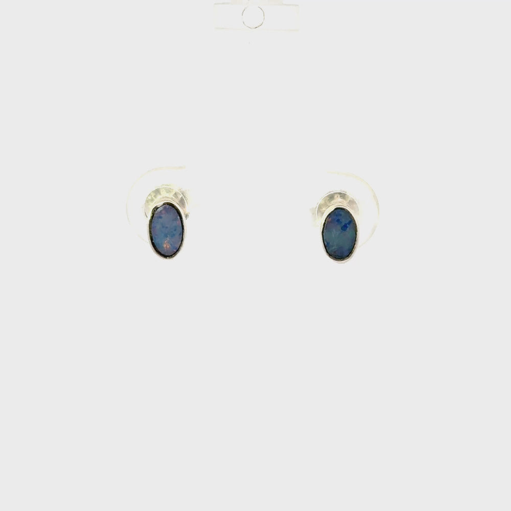 These striking stud earrings feature oval-cut Australian Opals with mesmerizing blue flashes, bezel-set in polished Sterling Silver for a sleek and modern look. Each opal is unique, showcasing natural play-of-color that shifts with the light.