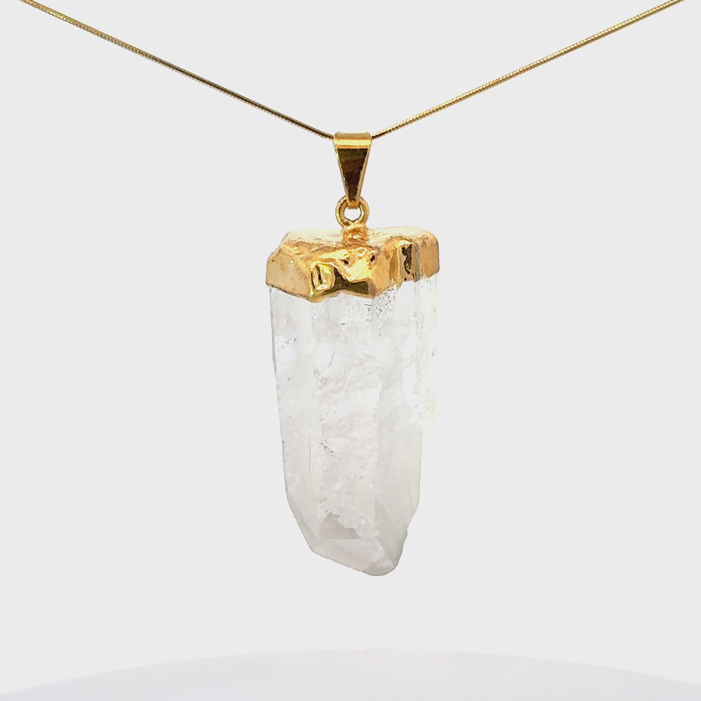 This elegant necklace showcases a polished Brazilian Clear Quartz pendant measuring approximately 40mm in height and 20mm in width. The pendant is paired with an 18" Gold Over Sterling Silver chain, blending timeless design with refined elegance.