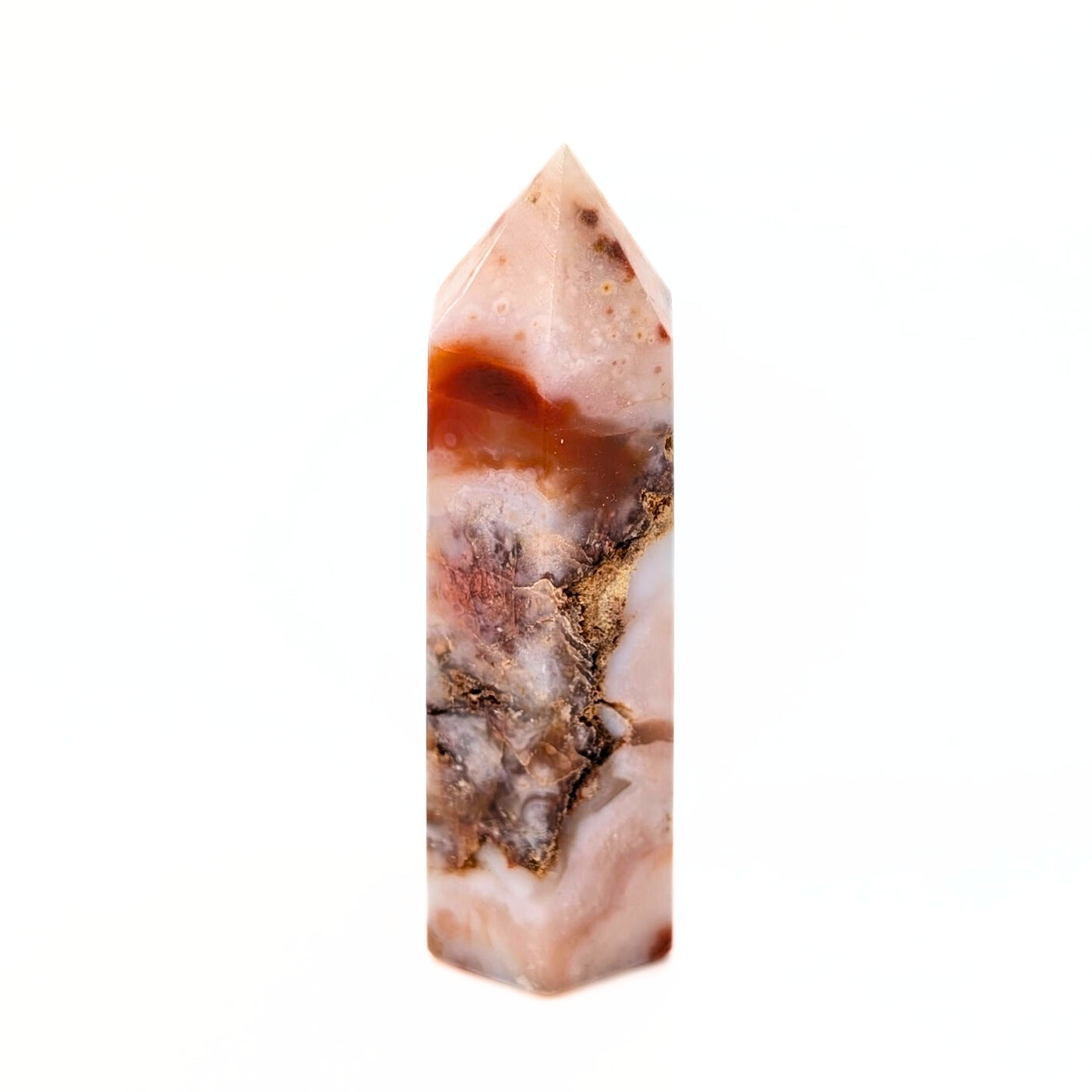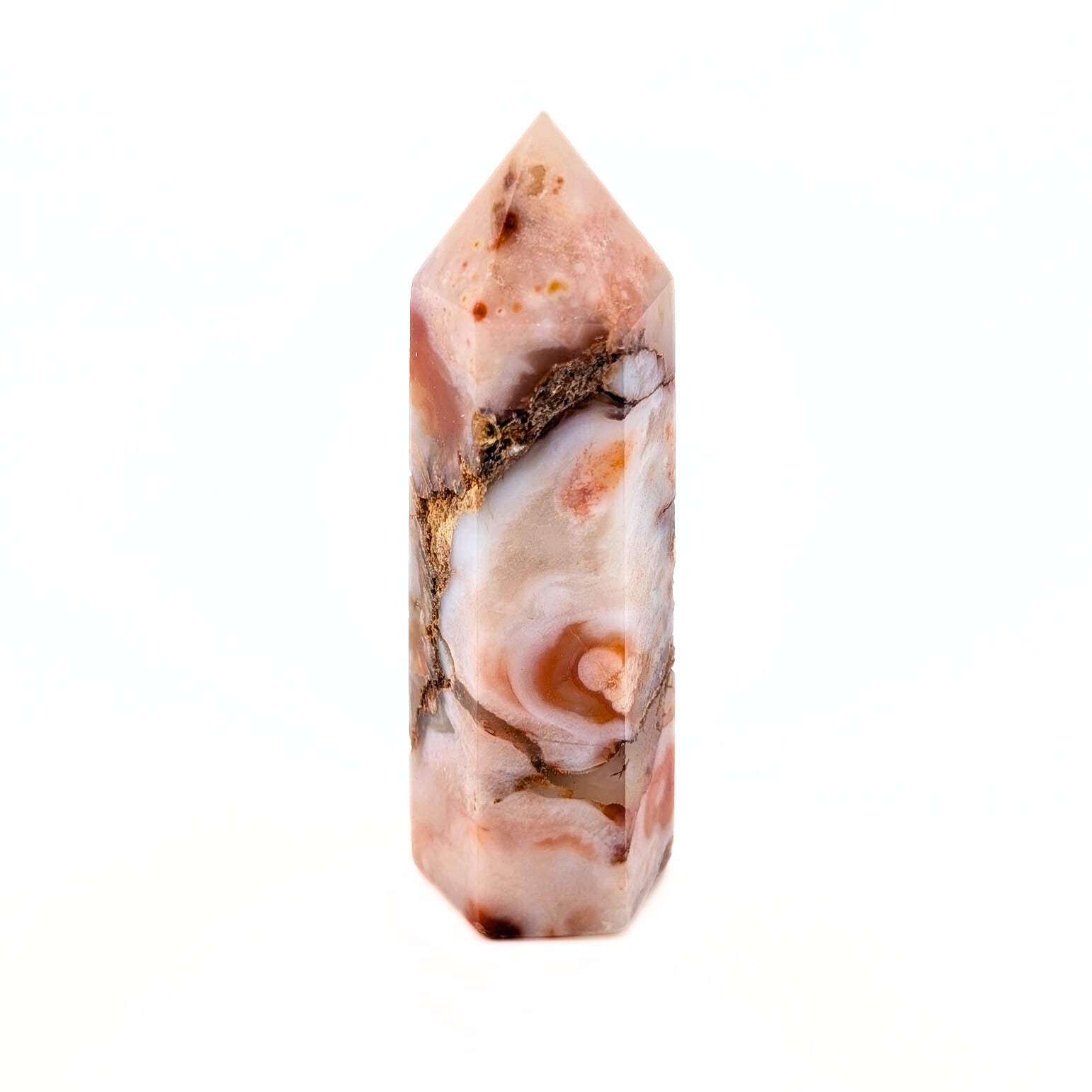This Carnelian polished tower features soft blush, peach, and warm terracotta tones with swirling patterns and natural matrix lines that give it beautiful depth from every angle. The smooth facets and pointed tip make it a lovely accent piece for a desk, altar, or bedside table while still being easy to hold during meditation.