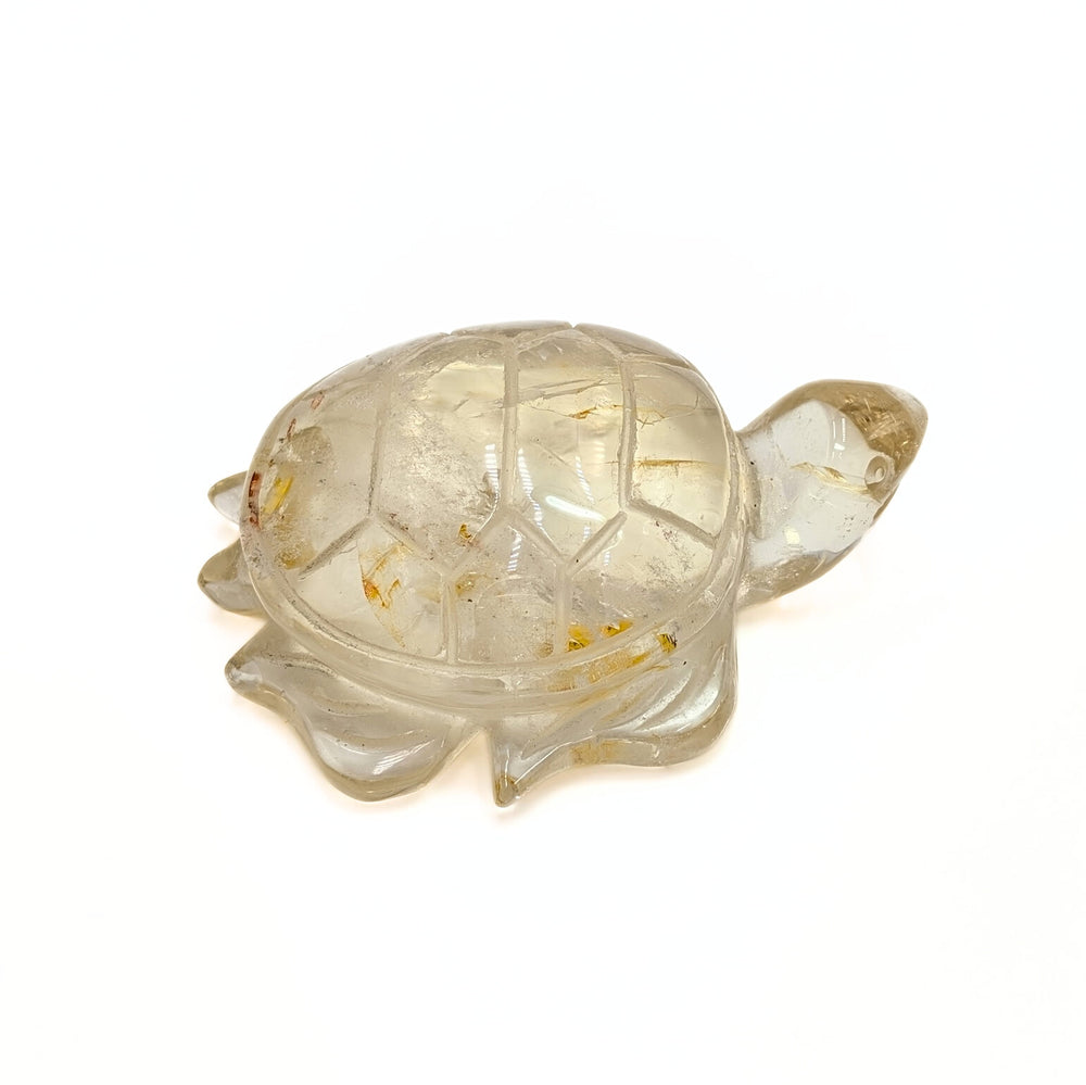 This radiant turtle figurine is carved from genuine Citrine, featuring soft golden hues with natural inclusions that bring warmth and depth to its appearance.