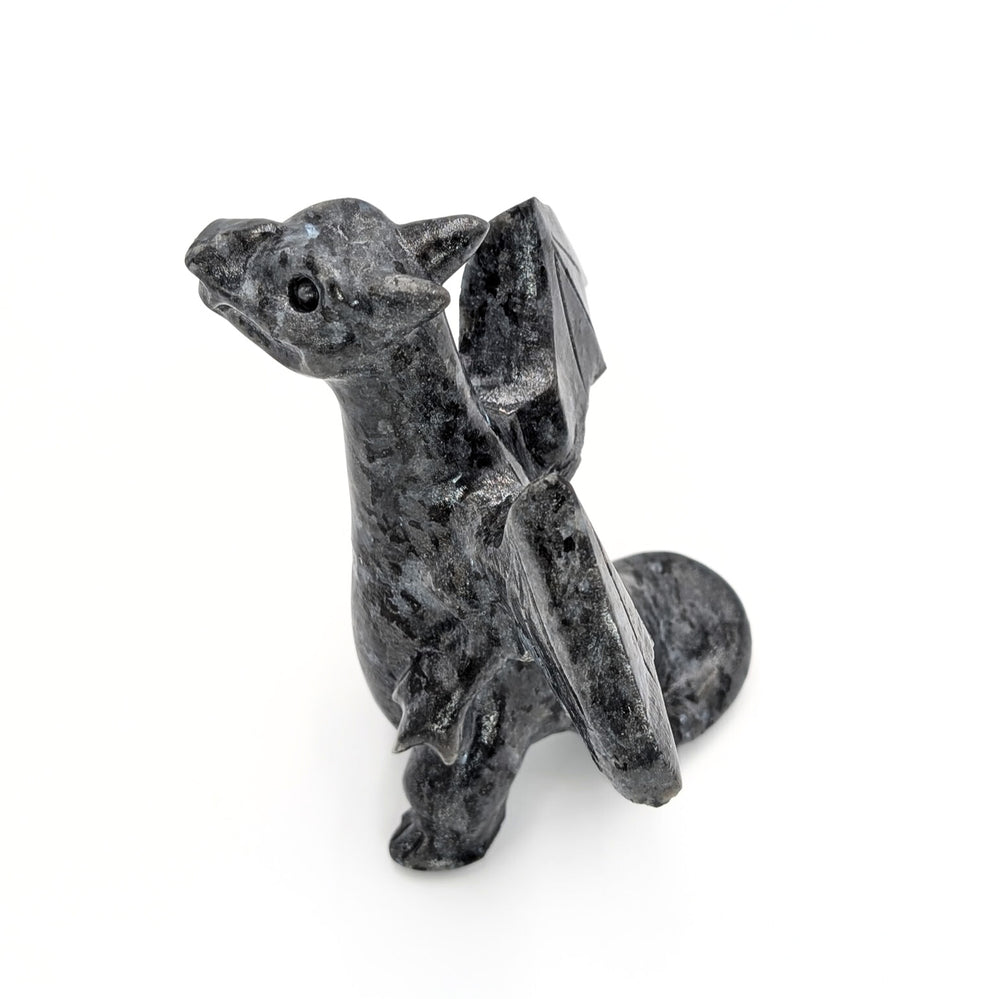 This striking figurine is carved from shimmering Larvikite, also known as Norwegian Moonstone, prized for its silvery-blue flashes and protective energy. Shaped in the likeness of the iconic Charizard Pokémon, it showcases dynamic detail in its wings, stance, and expression.
