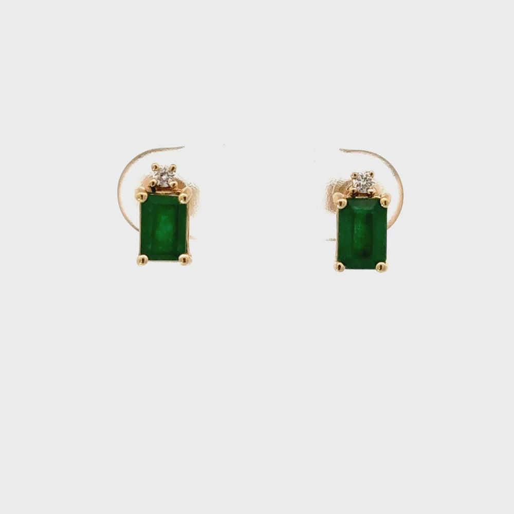 These elegant stud earrings feature vibrant emerald-cut Emeralds totaling 1.00 carat, set in secure four-prong 14K Yellow Gold mounts. Round brilliant-cut Diamond accents totaling 0.02 carat add a hint of sparkle, perfectly complementing the Emeralds’ rich green hue. A timeless and refined design, ideal for both everyday wear and special occasions.