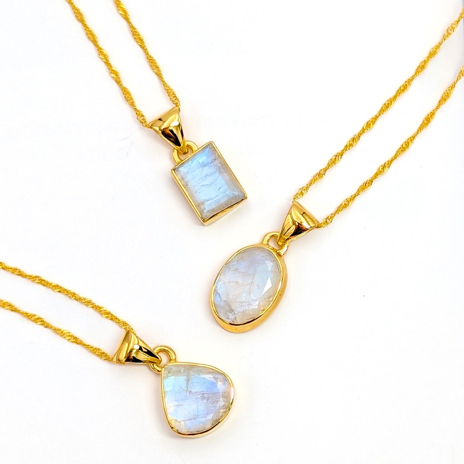 These Rainbow Moonstone pendant necklaces feature natural Rainbow Moonstone stones set in 18K Gold-Plated Sterling Silver and suspended from approximately 17–18" Gold Plated Sterling Silver Chains. Each pendant showcases Rainbow Moonstone’s signature luminous glow with soft flashes of light that shift as the stone catches different angles.