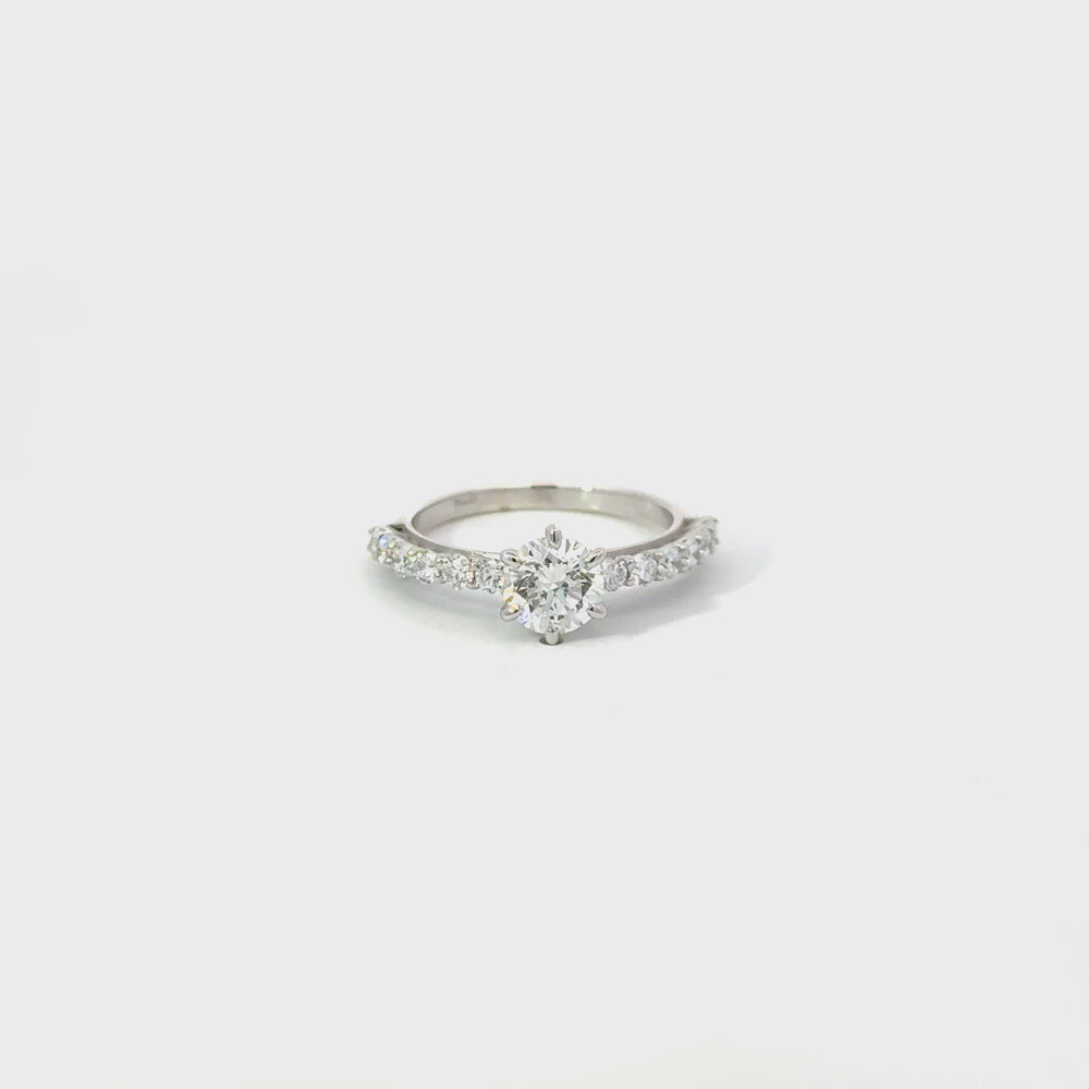 This stunning ring features a round brilliant-cut lab-grown Diamond at the center, weighing approximately 1.10 carats. Framing the center stone are twelve round-cut accent Diamonds—six on each side—each approximately 0.05ct, totaling around 0.60 carats. All diamonds are VVS1 clarity and F/G color, offering exceptional brilliance and clarity.