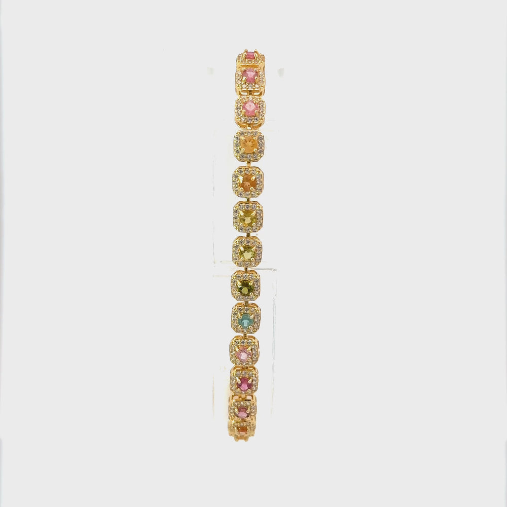 Add a splash of vibrant elegance to your collection with this stunning tennis bracelet. Featuring round-cut multicolored Tourmaline gemstones, each framed with a sparkling round-cut White Tourmaline halo, this piece radiates both color and sophistication.