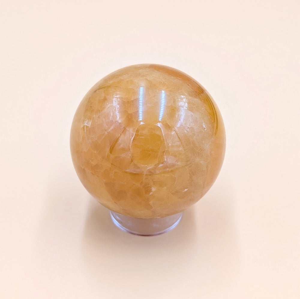 This vibrant Orange Calcite sphere radiates warm, sunny energy through its polished surface and soft marbled glow. Swirls of golden amber and honey hues dance within the stone, creating a sense of movement and light.