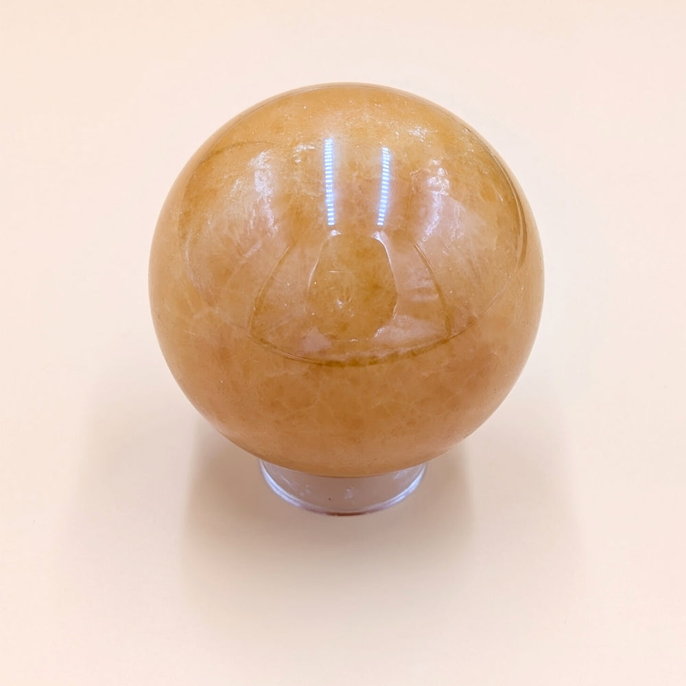 This radiant Orange Calcite sphere glows with vibrant golden tones and soft, honey-like translucence. Its polished surface highlights gentle marbling and natural mineral veining, creating a warm and luminous energy.