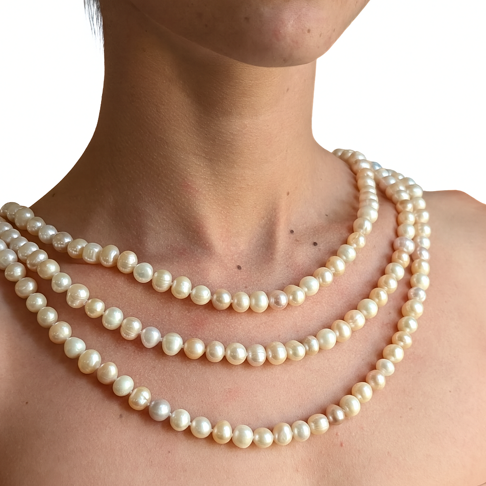 This vintage freshwater pearl necklace features a continuous strand of lustrous pearls in soft white and champagne tones, each measuring approximately 8–9mm.