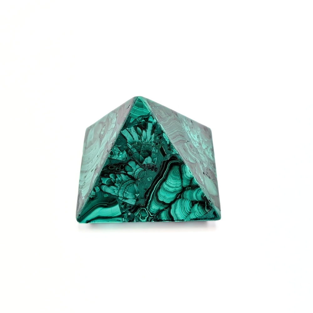 This striking Malachite pyramid showcases vivid green banding and intricate natural patterns that highlight the stone’s unique beauty.