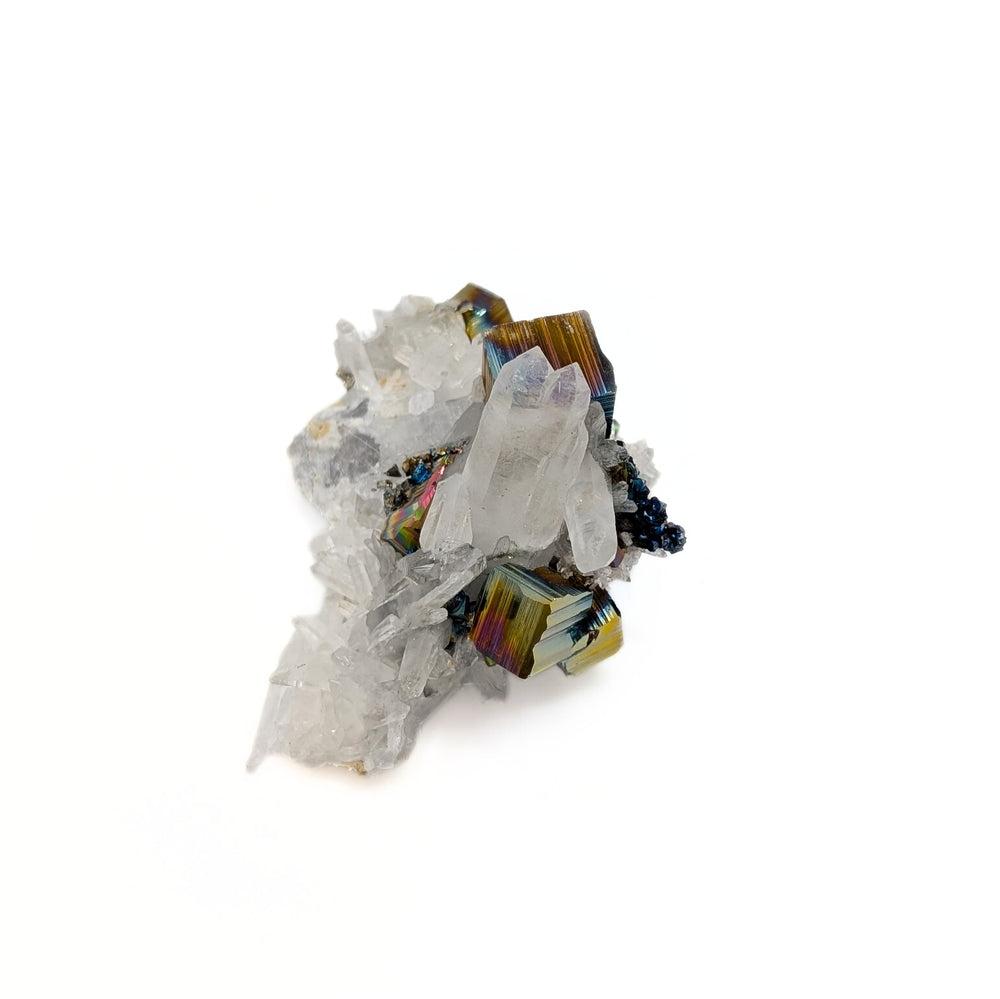 This elegant freeform showcases iridescent Rainbow Pyrite crystals intergrown with sparkling Quartz points on a natural matrix. The Pyrite’s vivid metallic sheen contrasts beautifully with the Quartz’s clear brilliance, creating a specimen both captivating and harmonious.