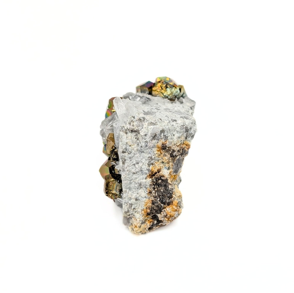 This striking freeform specimen showcases the shimmering iridescence of Rainbow Pyrite alongside the clarity of Quartz Crystals. Vibrant rainbow hues dance across Pyrite’s natural cubic surfaces, while delicate Quartz points add contrast and brilliance.