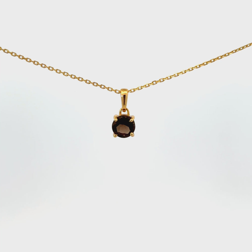 This elegant necklace features a round-cut Smoky Quartz set in a classic four-prong setting, crafted in gold over sterling silver. The deep, earthy tones of the stone pair beautifully with the warm golden finish, creating a timeless and grounding piece.