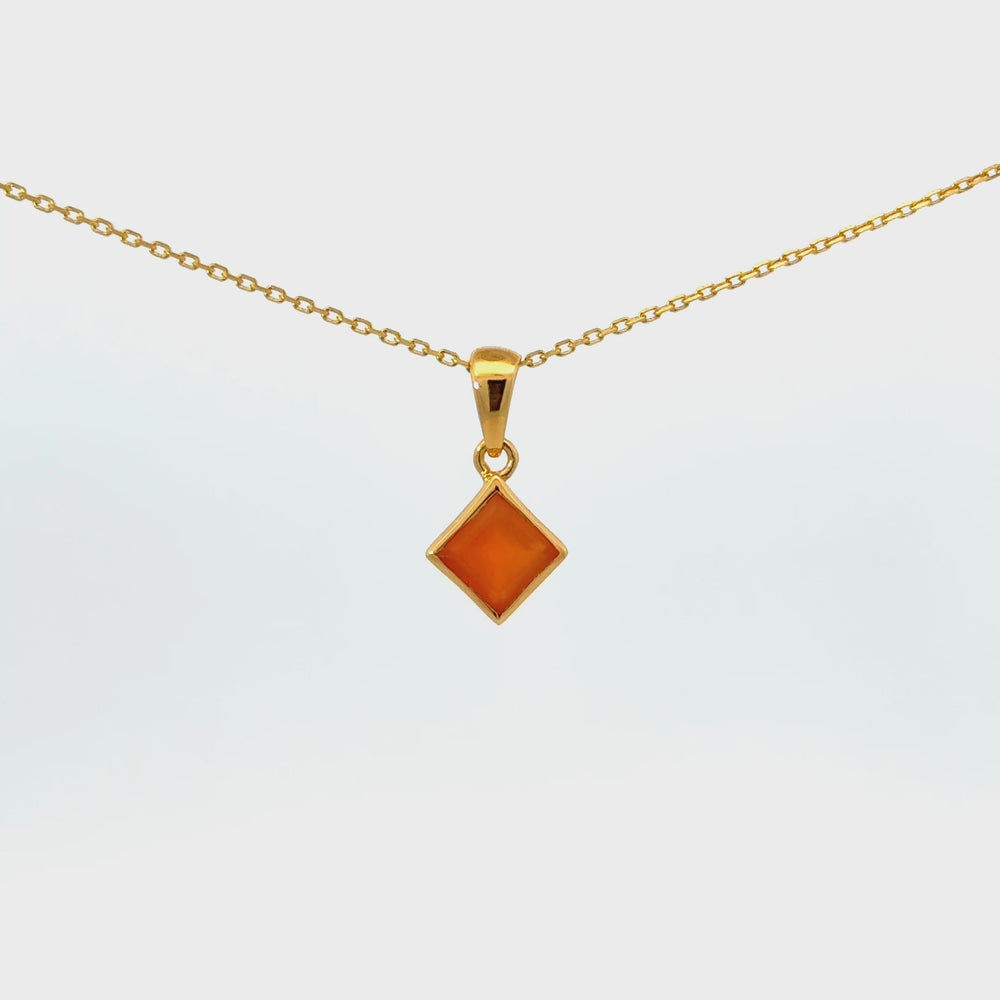This radiant necklace showcases a square-cut Carnelian gemstone set in a sleek bezel setting, crafted in gold over sterling silver. The bold orange hue of the Carnelian brings warmth, energy, and vibrance to the piece, beautifully accented by the rich gold finish.