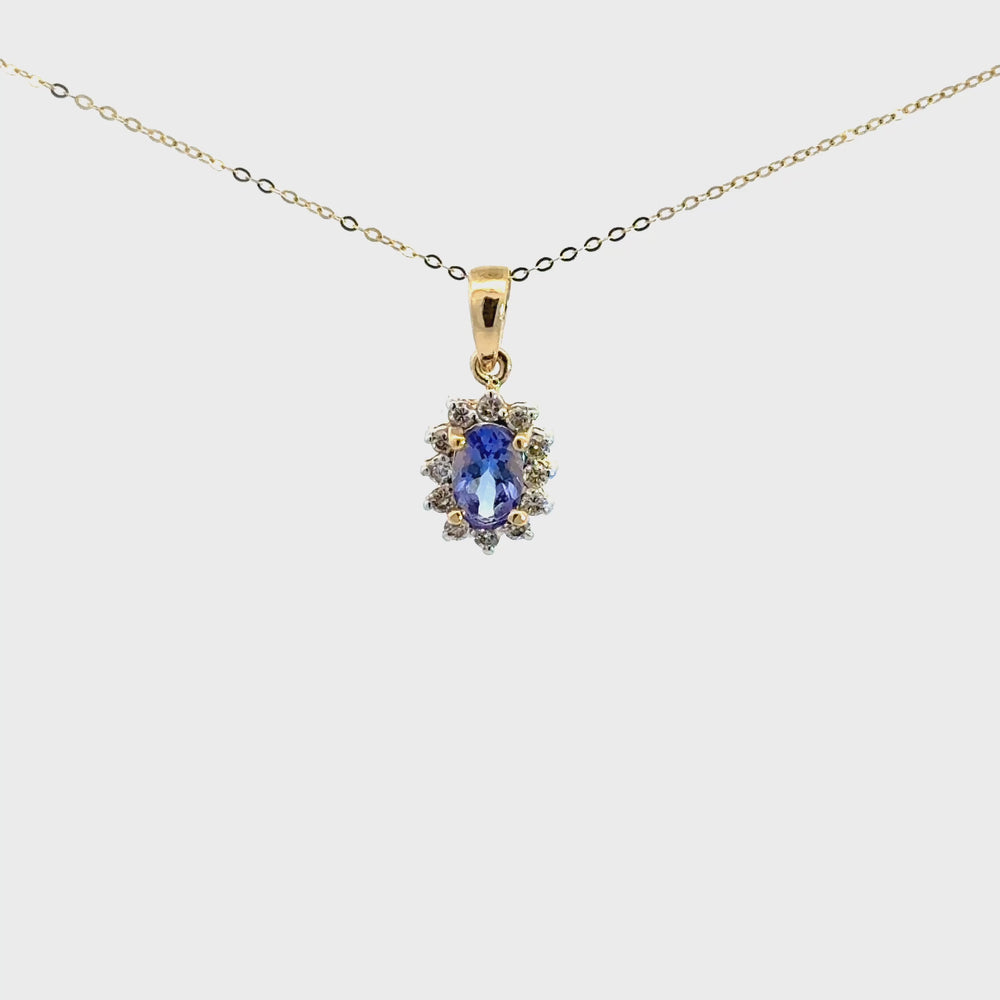 This necklace showcases a vivid violet-blue oval-cut Tanzanite center stone measuring approximately 0.50 carats, surrounded by a sparkling halo of round brilliant-cut Diamonds totaling about 0.15 carats.