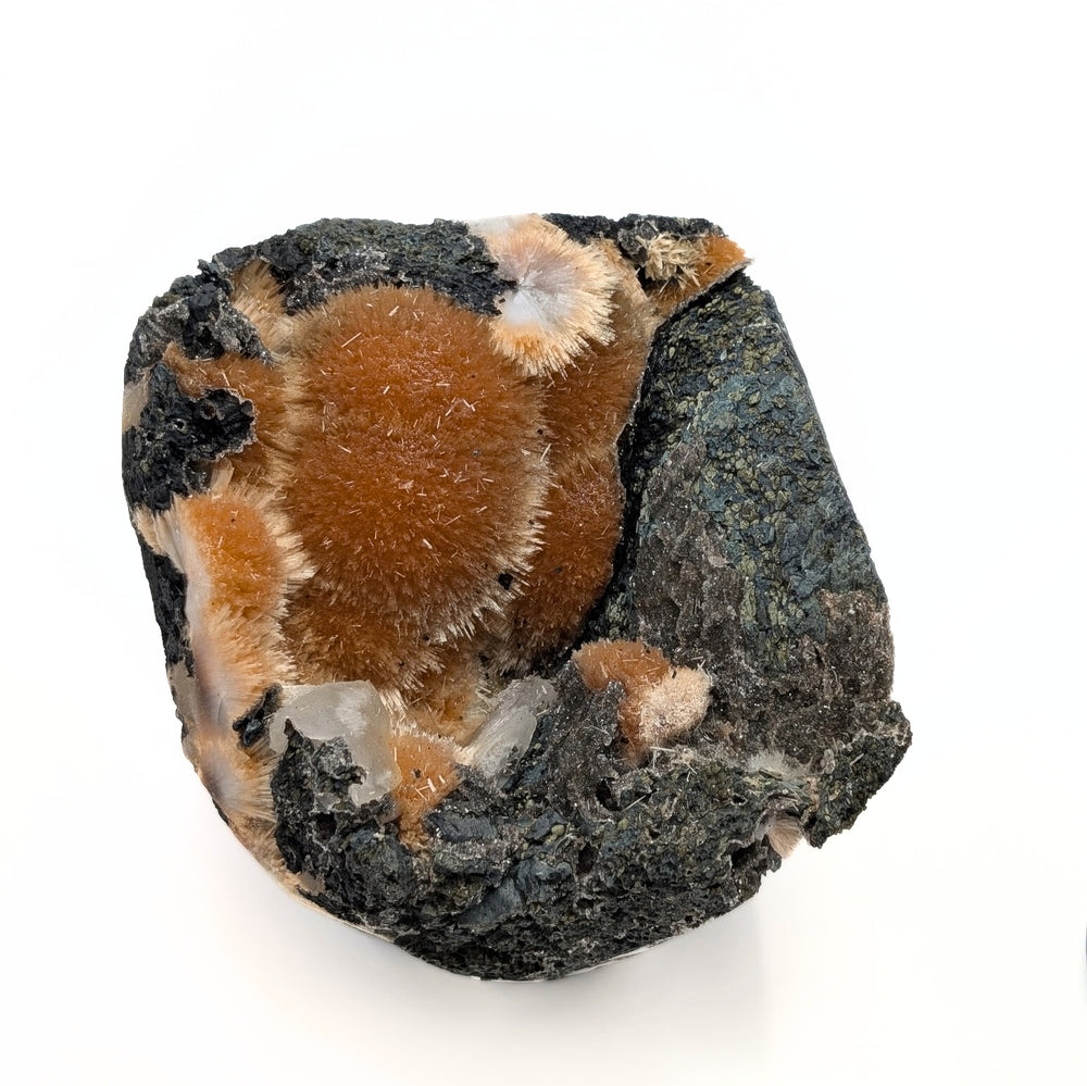 This extraordinary specimen features vibrant orange Thomsonite, accented by soft, radiating sprays of Mesolite growing directly atop the Thomsonite formations. Delicate white Calcite and a contrasting Heulandite matrix add layers of texture and depth. Rich in color, crystal structure, and mineral variety, this piece is a stunning example of nature's artistry—ideal for collectors, display shelves, or metaphysical spaces.
