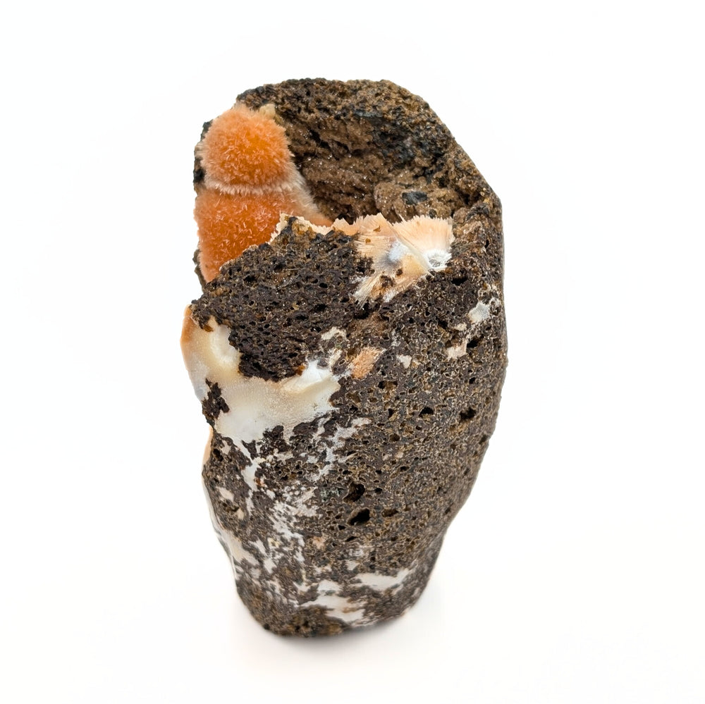 This beautiful specimen features vibrant orange Thomsonite with fine sprays of Mesolite crystals growing directly on its surface, creating an eye-catching contrast of texture and form. Accented by white Calcite and set in a grounding brown Heulandite matrix, this piece showcases the natural harmony of zeolite minerals. A stunning addition for collectors, crystal lovers, or as a unique display piece.