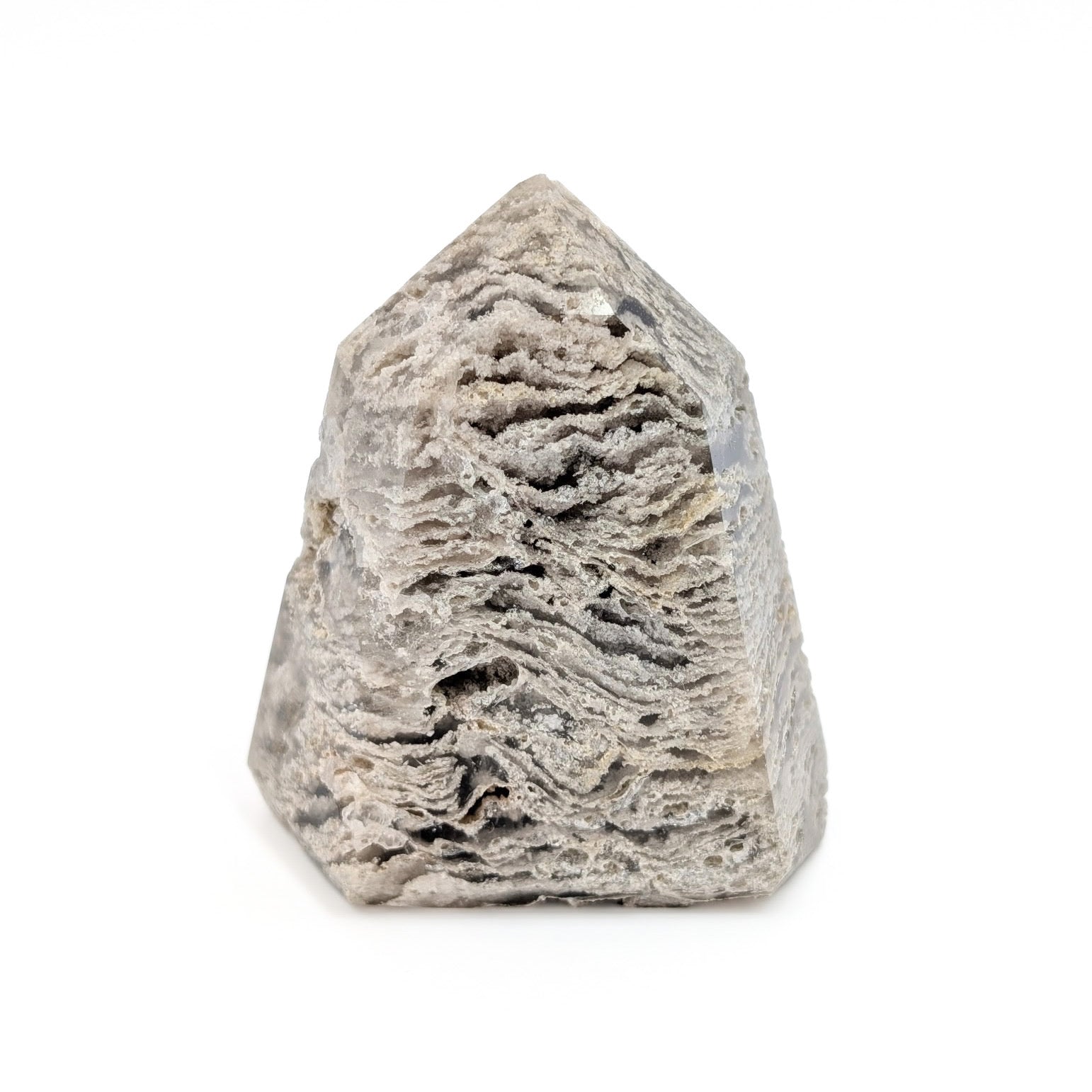 This 'Thousand Layer' Garden Quartz polished tower displays naturally formed layered inclusions created as minerals settled in stages during the Quartz’s growth. These distinct layers form a striated, landscape like appearance that gives the stone depth, texture, and visual movement.