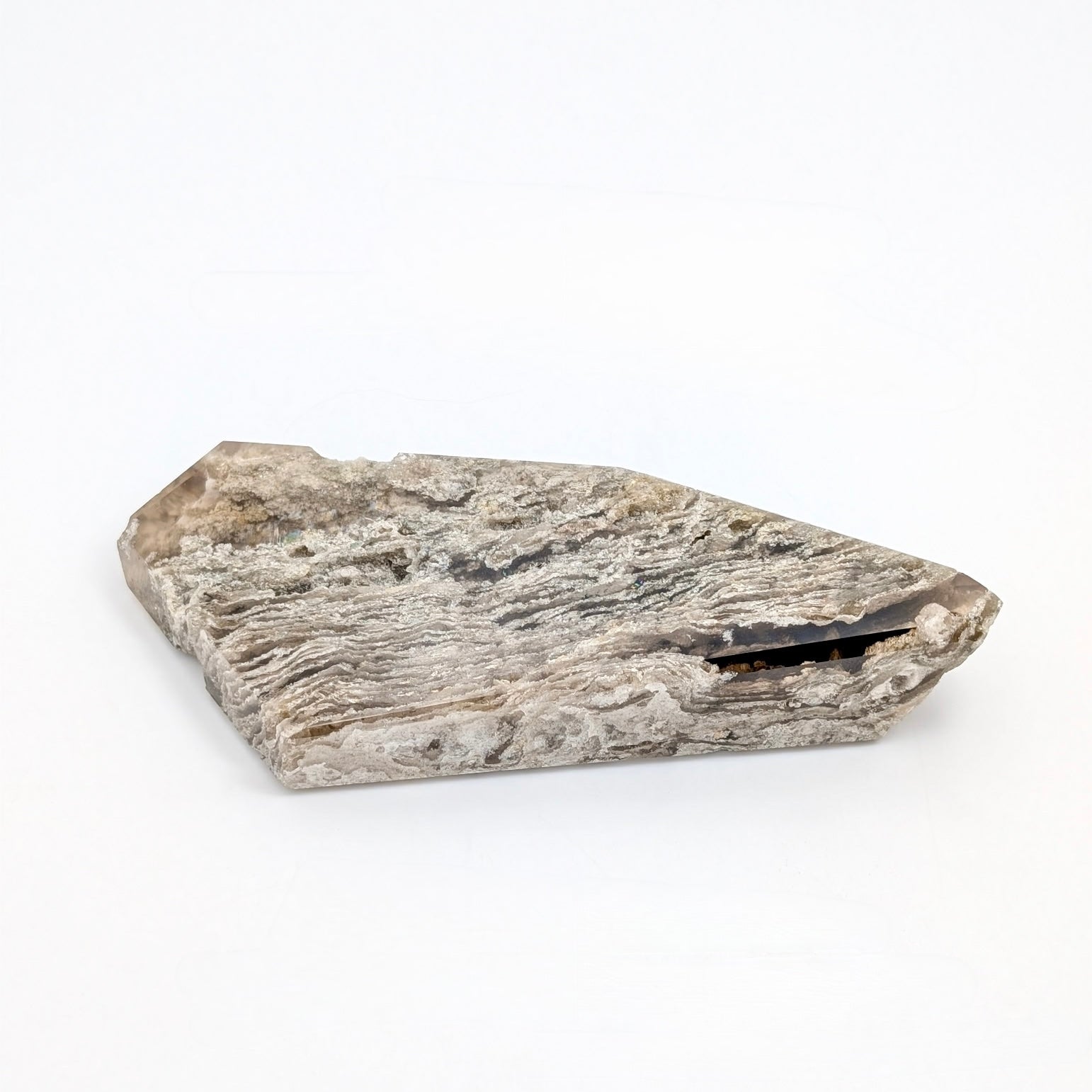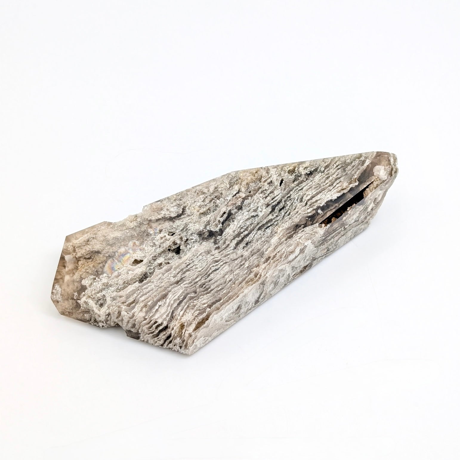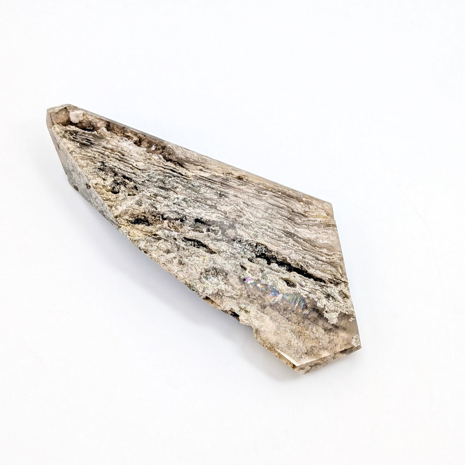 This piece also features a natural internal rainbow, visible when light passes through the Quartz, adding a subtle iridescent flash within the layered structure. Variations in pattern, density, and clarity are natural and highlight the individuality of this 'Thousand Layer' Garden Quartz specimen.