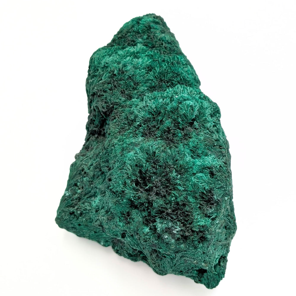 This raw freeform specimen is crafted from genuine Velvet Malachite, featuring rich green hues and intricate, fibrous crystal formations that create its signature soft, velvety texture.
