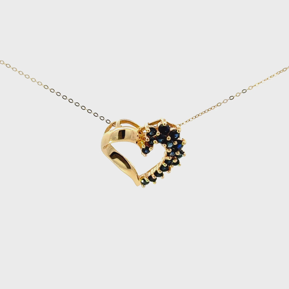 Vintage Blue Sapphire Heart Necklace Set in 14k Yellow Gold