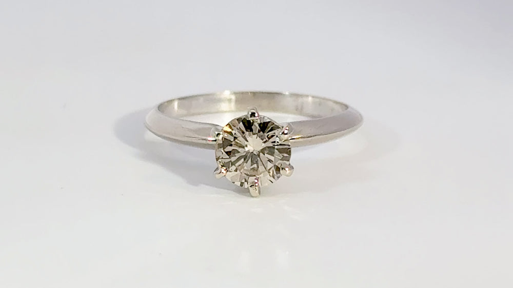 This 14K White Gold US size 7 ring hosts a round brilliant cut Diamond. The Diamond is color grade L-M and SI1 clarity. The approx. size is .25" wide and long, and .19" tall, with approx. 1.28 CT TW.