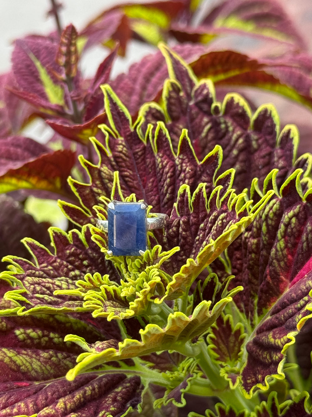 Add a touch of sophistication to any outfit with this elegant ring featuring a stunning emerald cut deep Blue Sapphire measuring approximately 14mm tall and 9mm wide, set on a minimalist US size 6 Sterling Silver band.