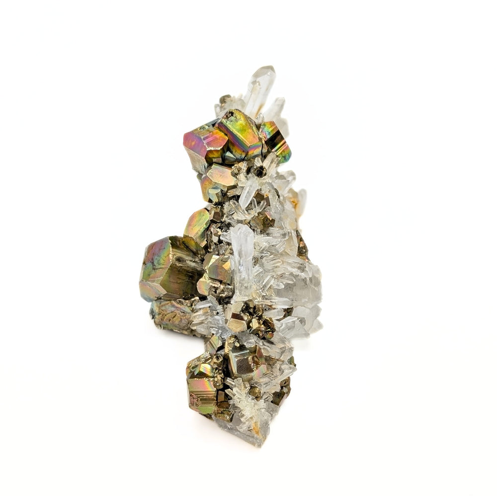 This striking freeform specimen showcases the shimmering iridescence of Rainbow Pyrite alongside the clarity of Quartz Crystals. Vibrant rainbow hues dance across Pyrite’s natural cubic surfaces, while delicate Quartz points add contrast and brilliance.