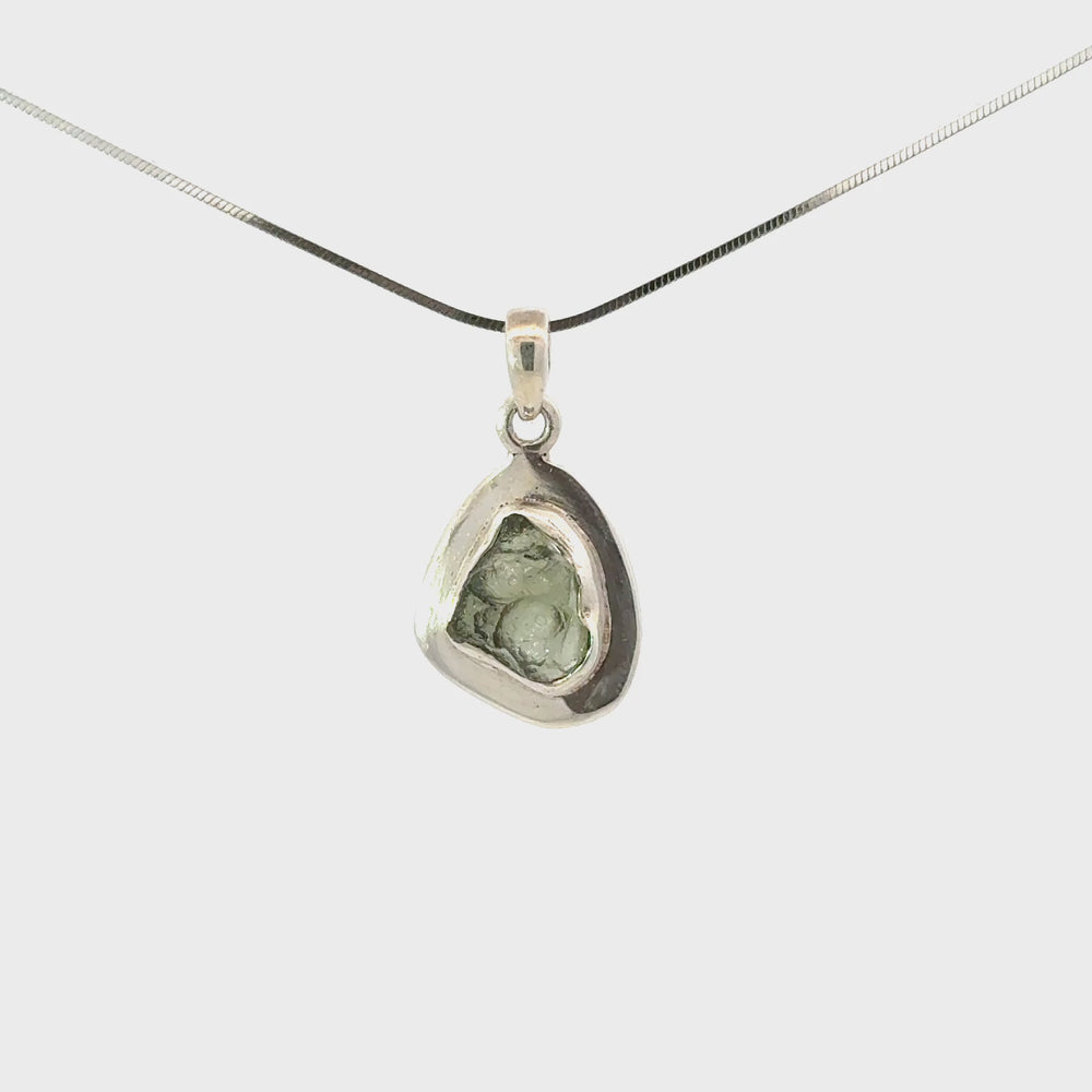 This captivating necklace showcases a raw, uncut Moldavite specimen, cradled in a sleek Sterling Silver bezel setting that highlights the stone’s natural texture and mossy green hue.