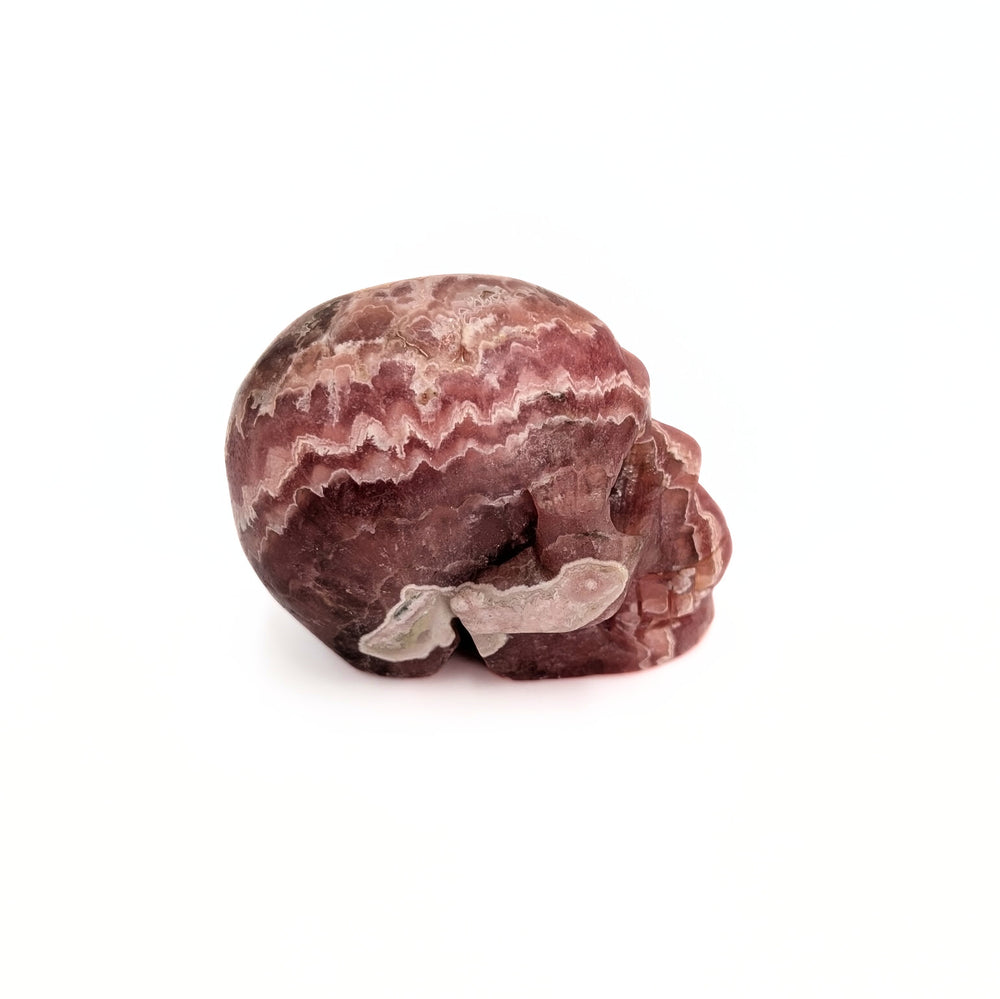 This striking Rhodochrosite skull features soft pink and rose-red hues with intricate natural banding and subtle variations throughout. Expertly carved with lifelike detail, it embodies both artistic elegance and symbolic depth—representing wisdom, transformation, and spiritual connection.