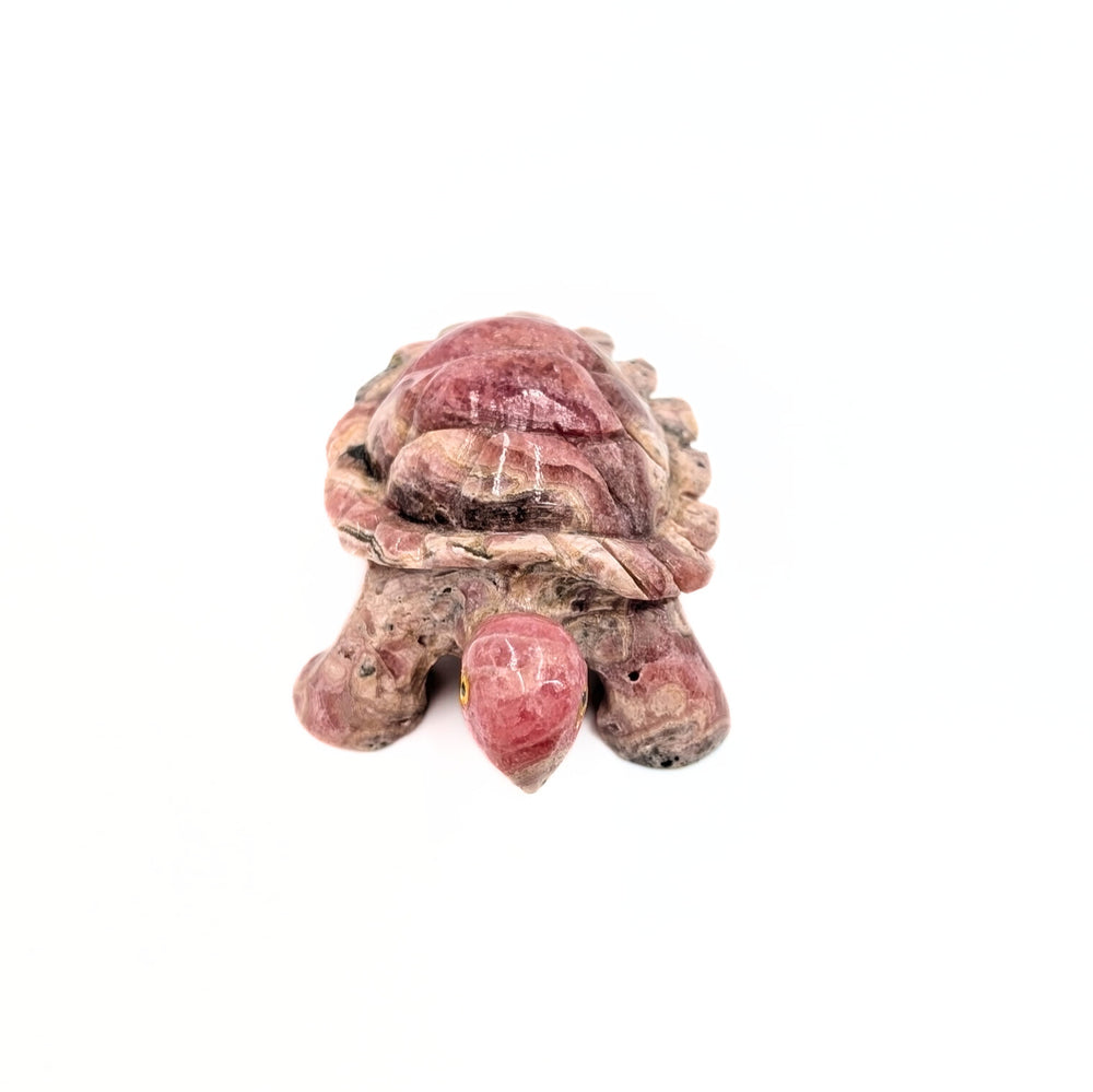 This charming tortoise figurine is expertly carved from natural Argentinian Rhodochrosite, displaying warm pink tones with subtle grey and cream veining unique to this rare gemstone. Smoothly polished to highlight the stone’s natural banding, the detailed shell and lifelike form bring a sense of calm and steady energy to any space.