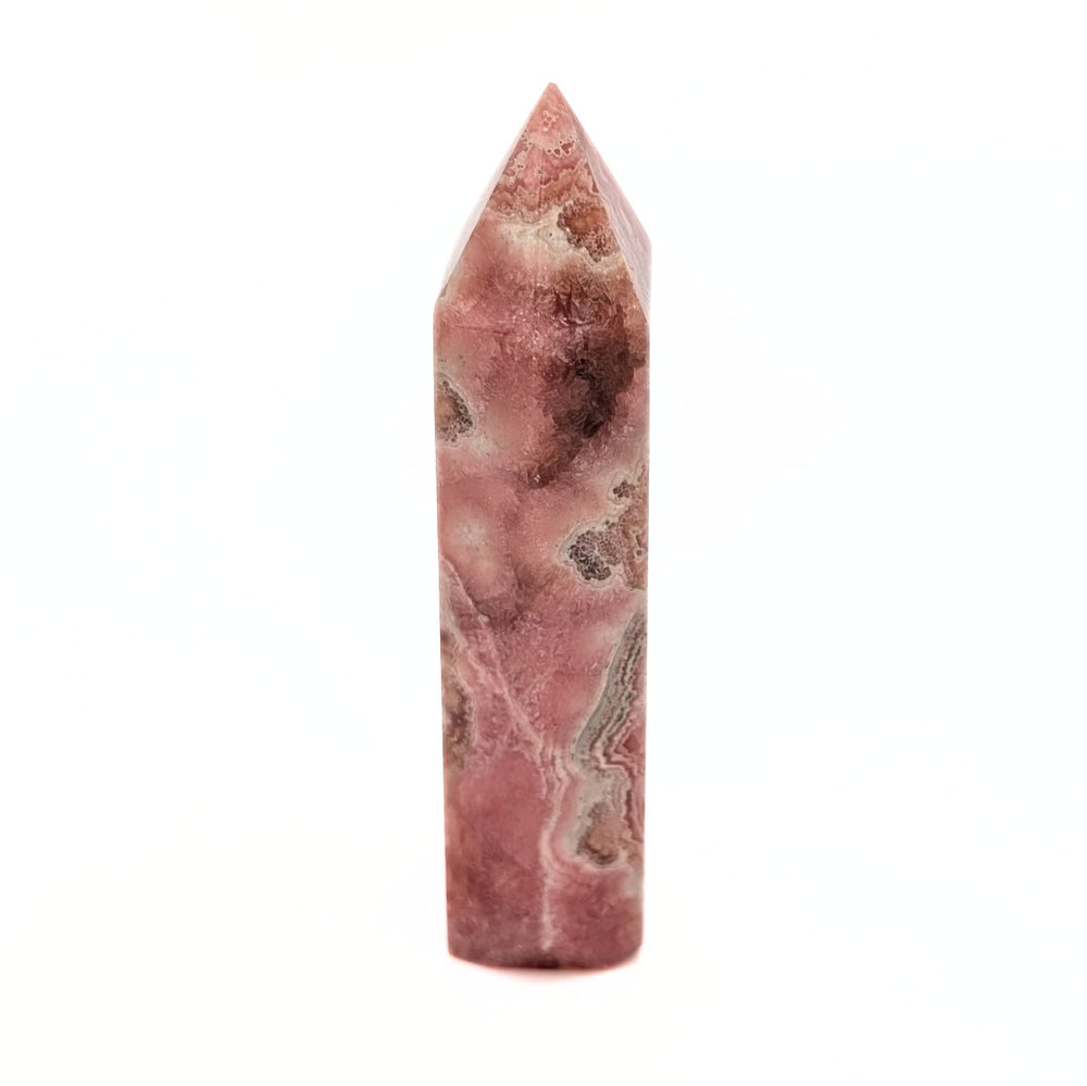 This stunning Rhodochrosite tower showcases deep pink hues layered with natural cream and earthy banding, highlighted by a smooth, polished finish.