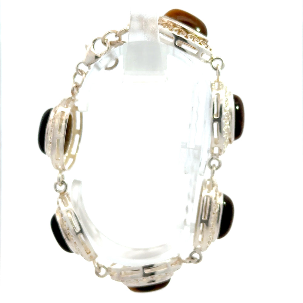 Add a touch of timeless elegance to your jewelry collection with this exquisite vintage bracelet, featuring richly colored Tiger's Eye cabochons set in ornate sterling silver. Each oval gemstone is framed by intricate, handcrafted metalwork, showcasing delicate scroll designs that evoke classic vintage artistry.