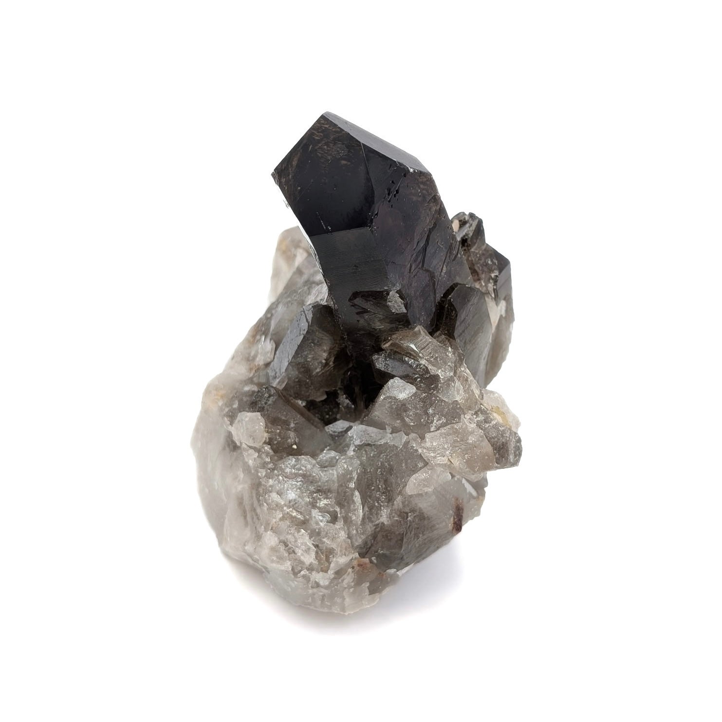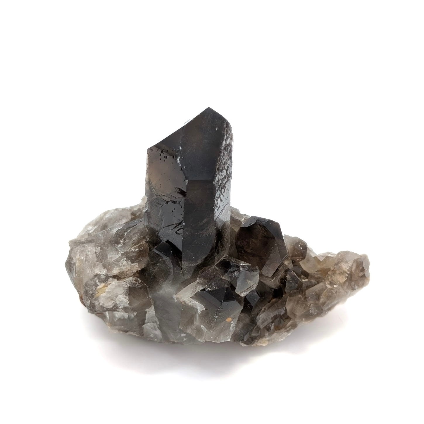 This Brazilian Smoky Quartz cluster features a bold, upright formation with deep smoky to near-charcoal crystal points emerging from a natural Quartz matrix.