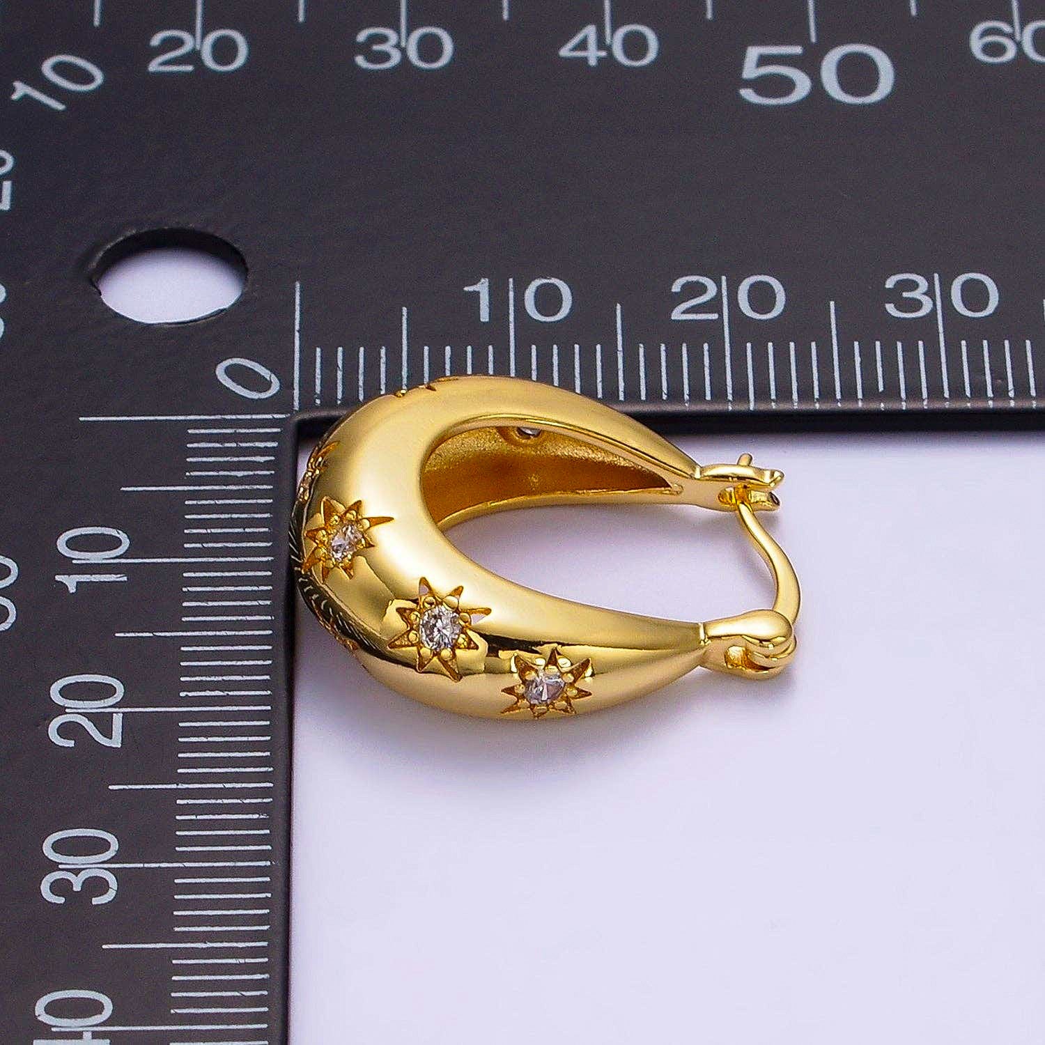 These elegant hoop earrings are crafted in 16K Gold-filled Brass and adorned with sparkling Cubic Zirconia accents set within delicate starburst motifs. The softly rounded silhouette and polished gold finish create a timeless design that balances classic charm with contemporary appeal.