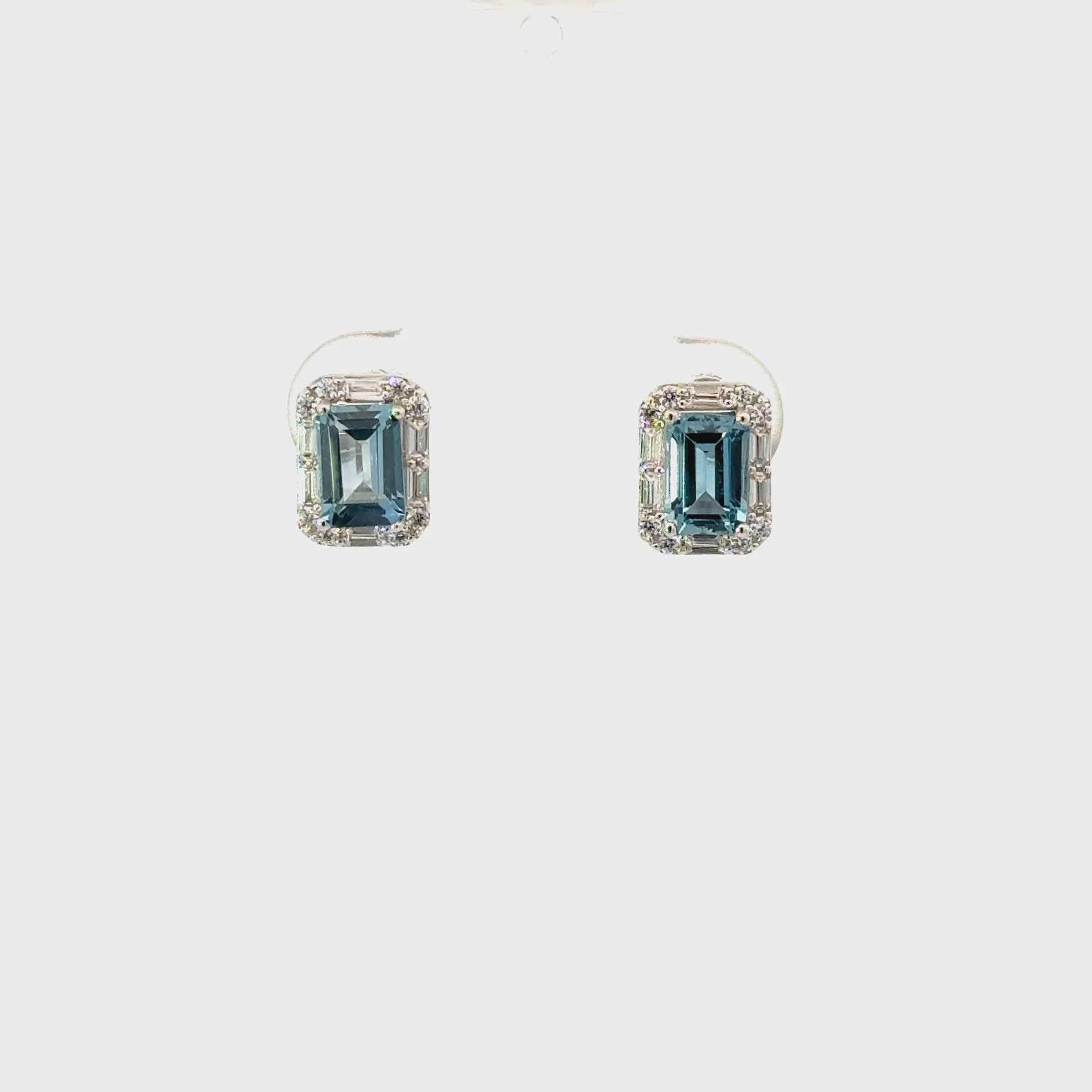 These Blue Topaz and Cubic Zirconia Earrings in Sterling Silver feature beautifully faceted emerald cut Blue Topaz centers framed by a halo of sparkling Cubic Zirconia accents. The cool, ocean blue tones of the Blue Topaz are enhanced by the brilliance of the surrounding stones, creating a crisp and luminous contrast.