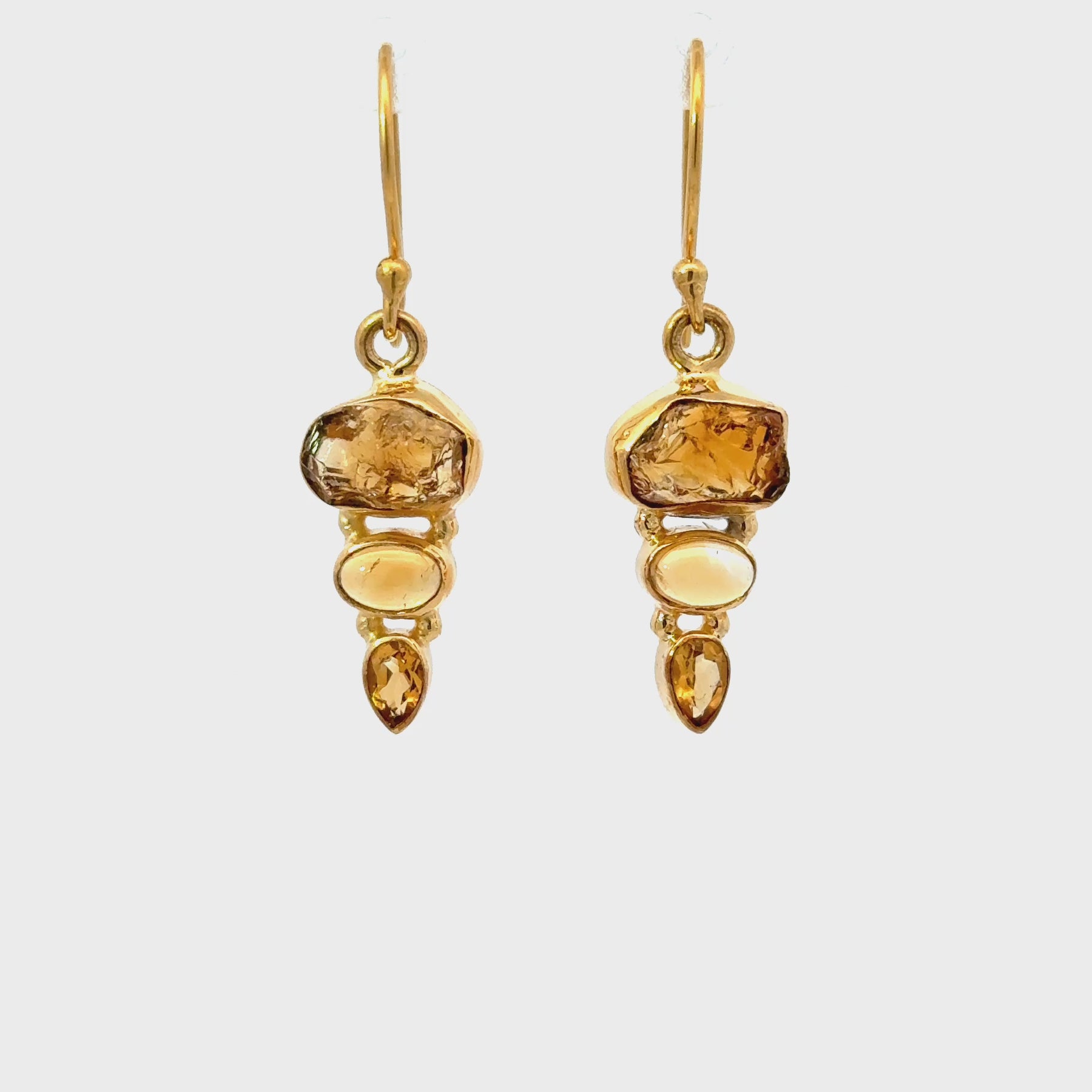 These luminous Citrine dangle earrings feature a graceful vertical arrangement of freeform, polished, and faceted stones, highlighting the gemstone’s warm golden hues and natural brilliance. The organic freeform top stones showcase citrine’s rich internal character, while the polished and faceted accents add refined sparkle and balance.