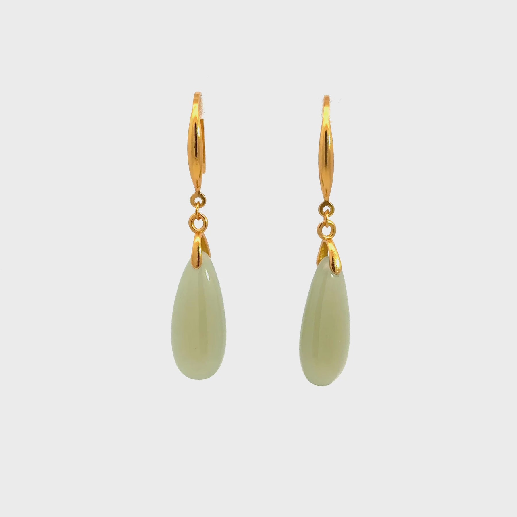 These elegant earrings feature smooth teardrop shaped Jade stones that display a soft, serene green tone with natural translucence and subtle depth. Each stone is suspended from polished Gold over Sterling Silver hooks, creating a refined contrast that highlights the gentle glow of the Jade.