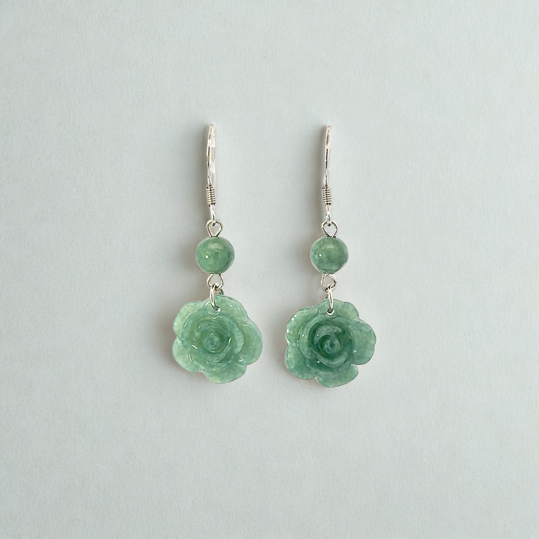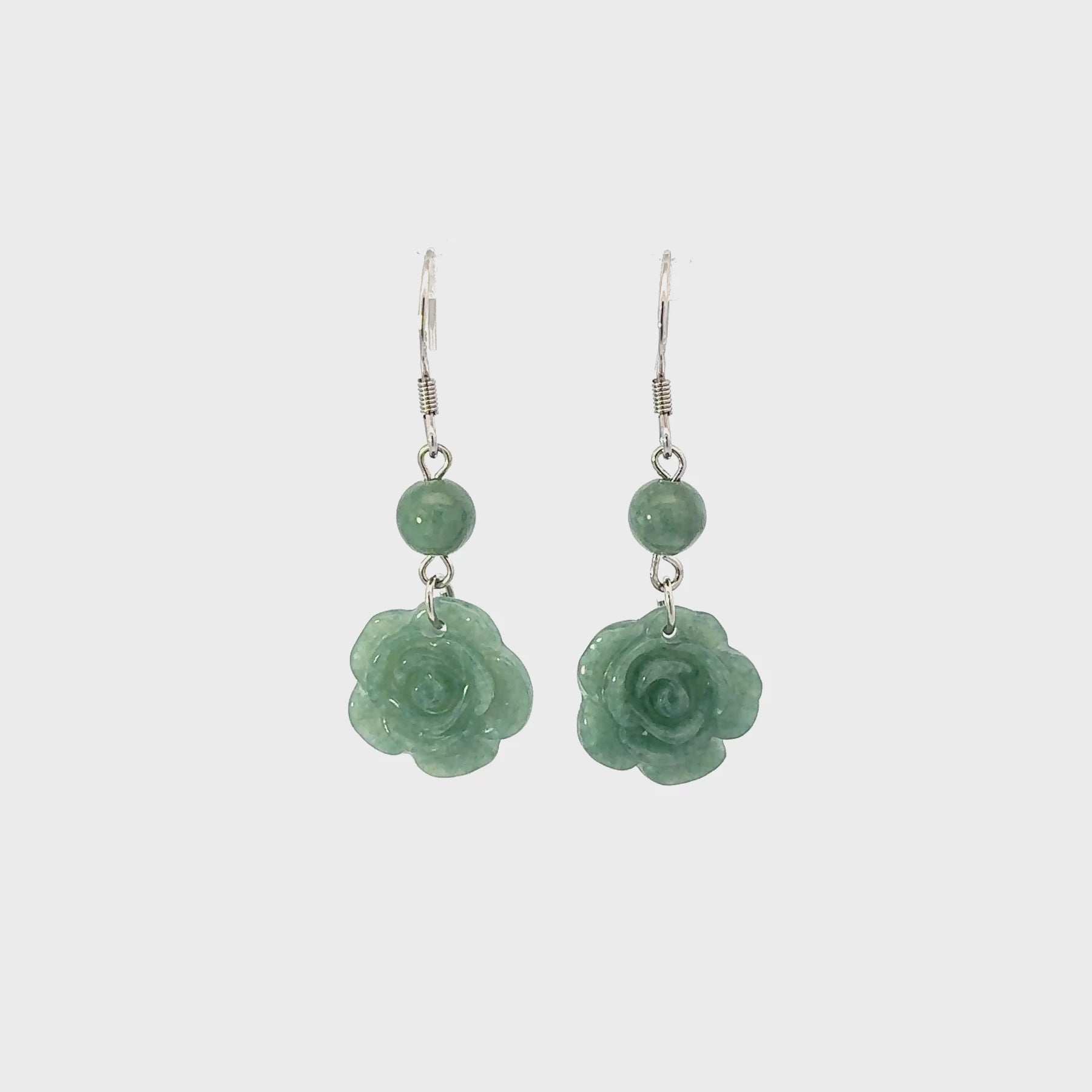These elegant dangle earrings showcase intricately hand-carved rose motifs crafted from natural Green Jadeite, accented by a polished Jadeite bead and set in Sterling Silver. Measuring approximately 40mm in drop length, they offer a graceful balance of color, texture, and shine.