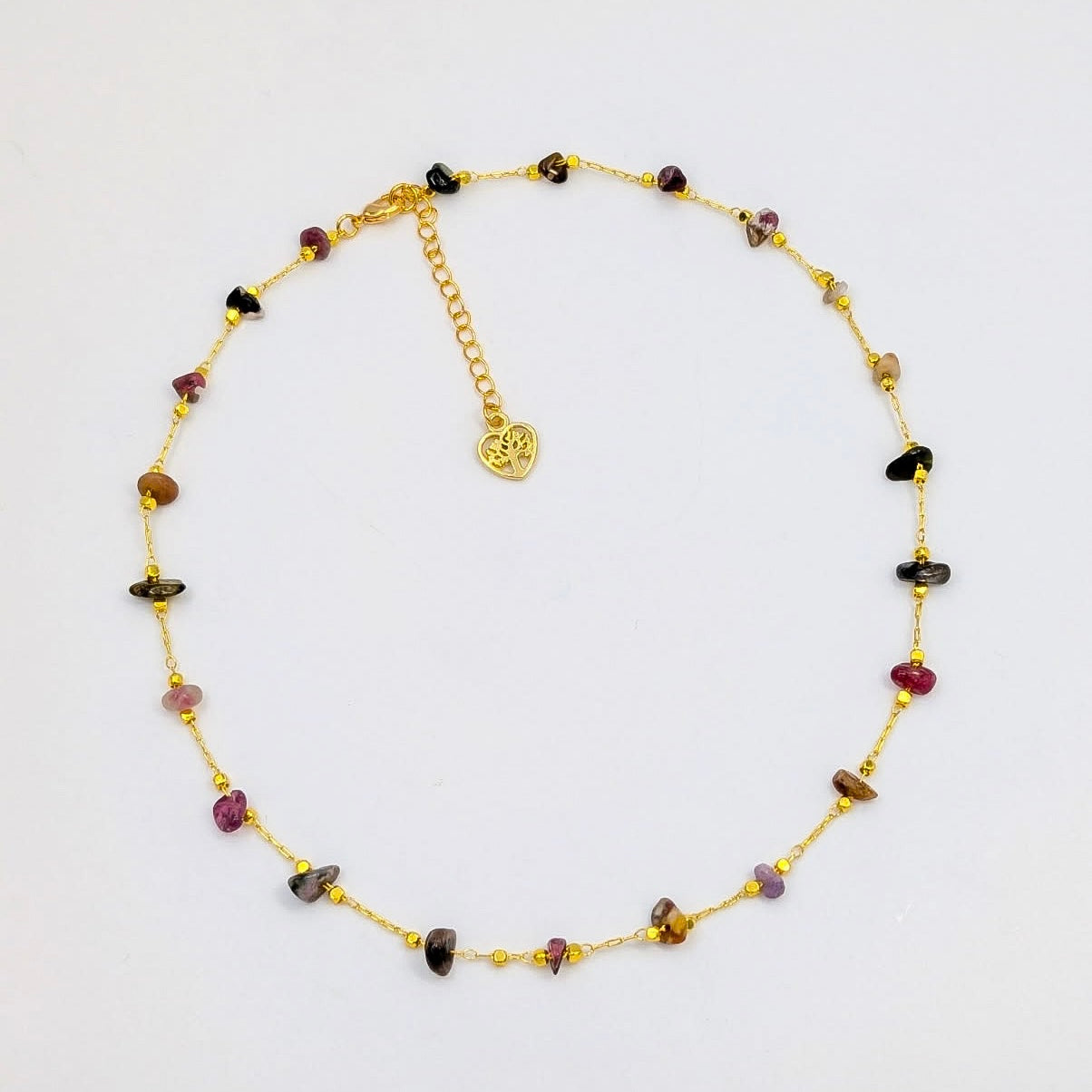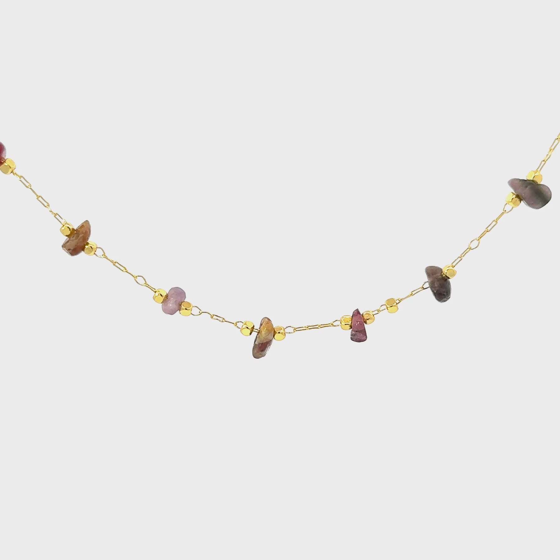 Watermelon Tourmaline Chip Necklace in Gold Plated Brass
