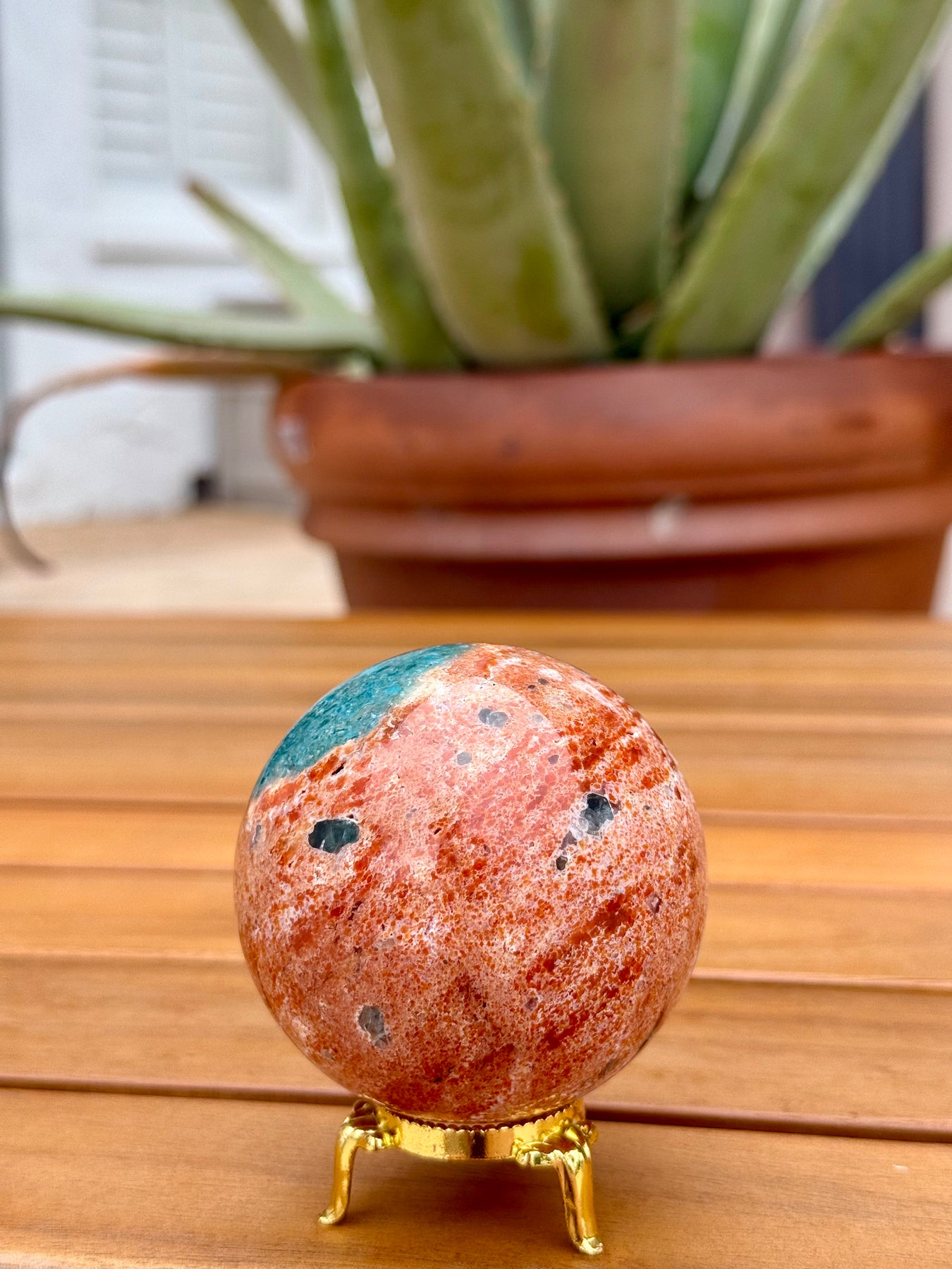 This captivating Sunstone and Apatite sphere weighs approximately 0.71 pounds (249.47 grams) with a circumference of about 8".