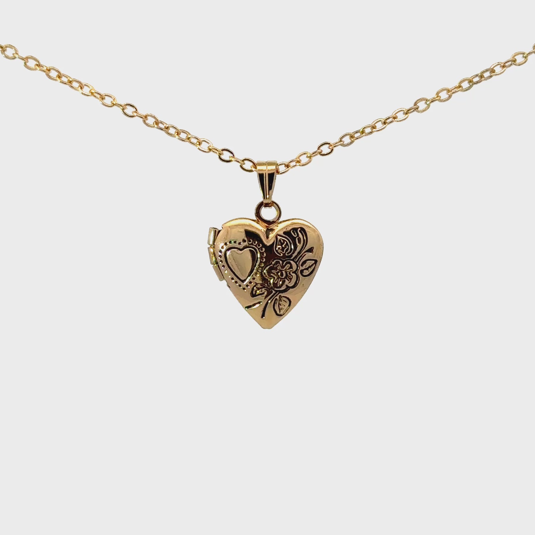 Floral Etched Gold Heart Locket Necklace in Gold Tone Metal