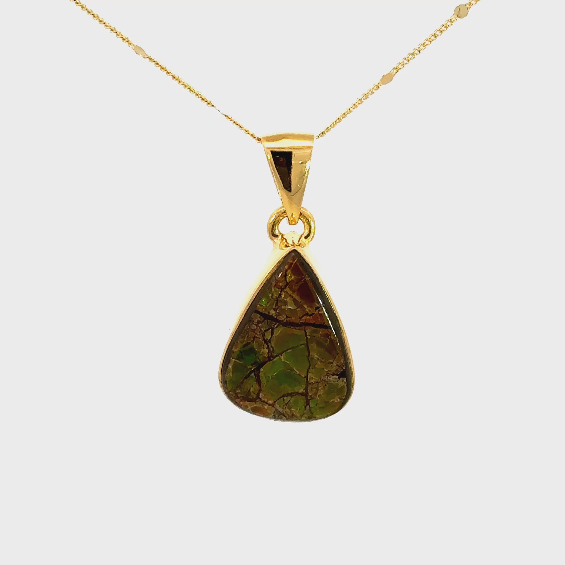 This elegant necklace features a genuine Ammolite gemstone showcased in a smooth 18K Gold-plated Sterling Silver setting. The teardrop silhouette highlights the stone’s natural mosaic pattern and iridescent color play, with rich flashes of green, gold, and warm earth tones that shift beautifully with the light. Each Ammolite is organically formed, making every pendant truly one of a kind.