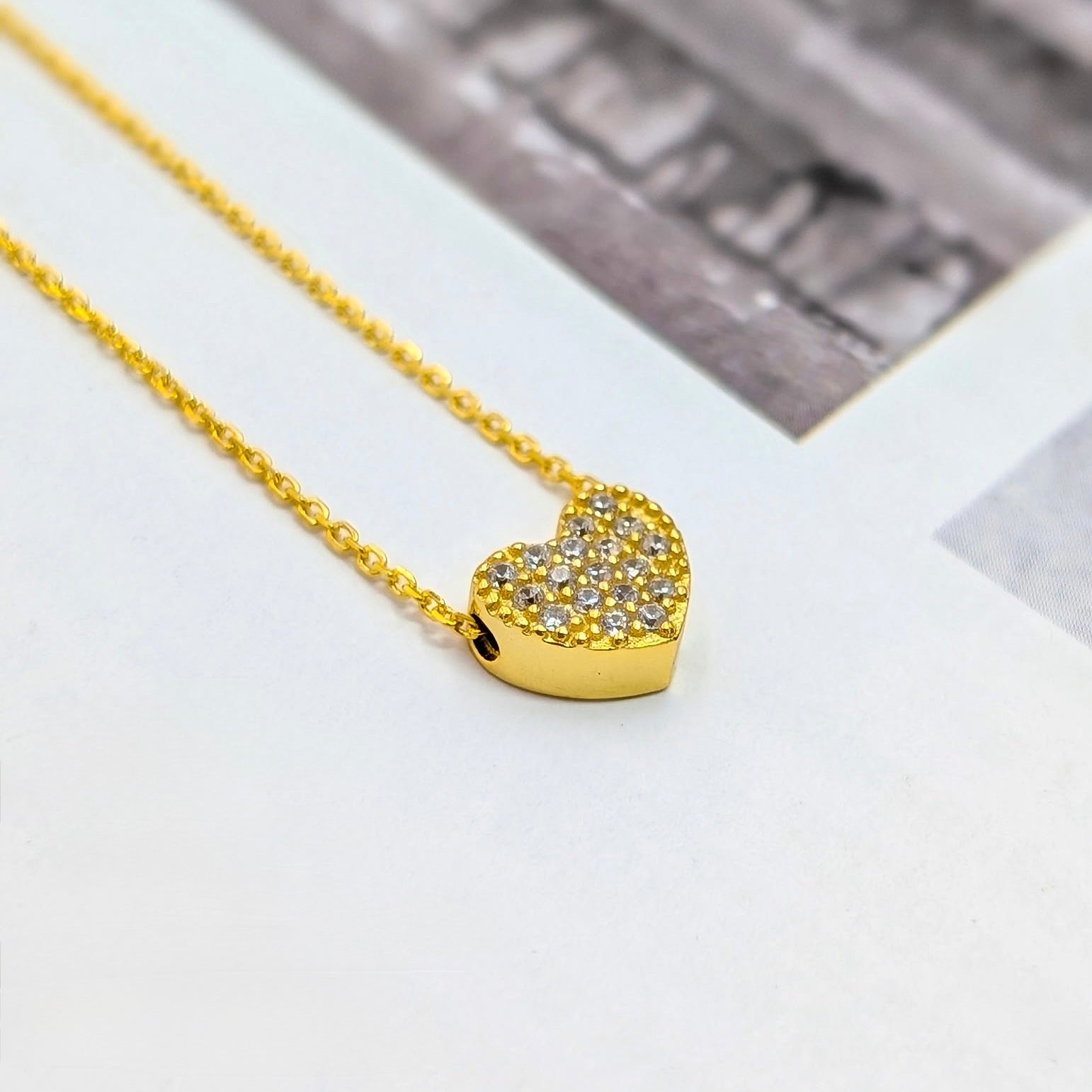 This 18K plated Sterling Silver necklace features a delicate heart charm set with sparkling Cubic Zirconia for a refined, timeless look. The pavé style shimmer adds just the right amount of brilliance while keeping the design clean and elegant.