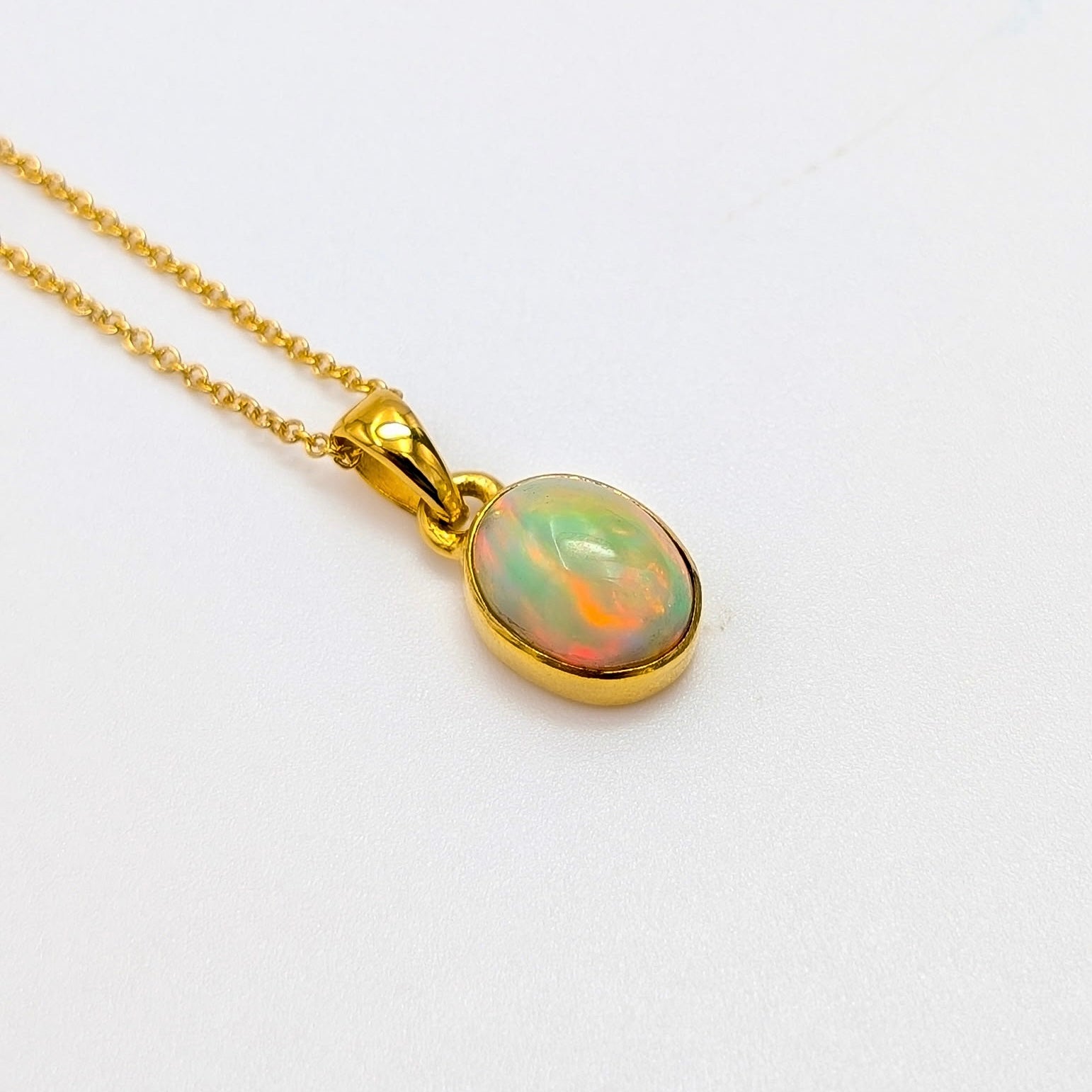 This elegant Ethiopian Opal necklace features a luminous natural opal displaying soft flashes of green, orange, and warm pastel tones that shift beautifully with movement and light. The Opal is bezel set in 18k Gold over Sterling Silver, offering a refined, timeless look that highlights the stone’s natural play of color while providing secure wear.