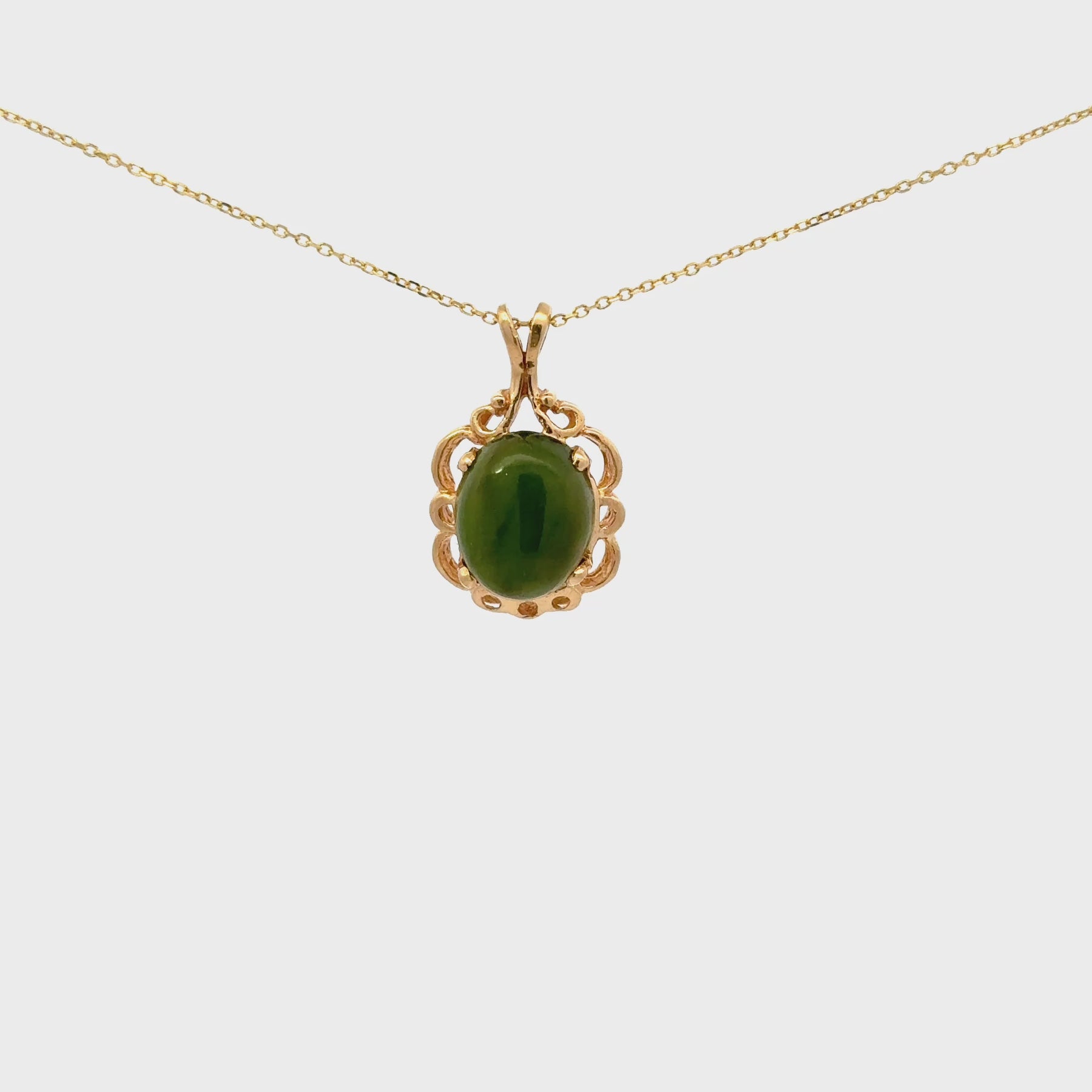 This elegant necklace features a vintage solid 14K Gold pendant adorned with a polished oval cabochon of natural Jade. The vivid green gemstone is framed by an intricately detailed gold design, showcasing fine craftsmanship and timeless artistry.