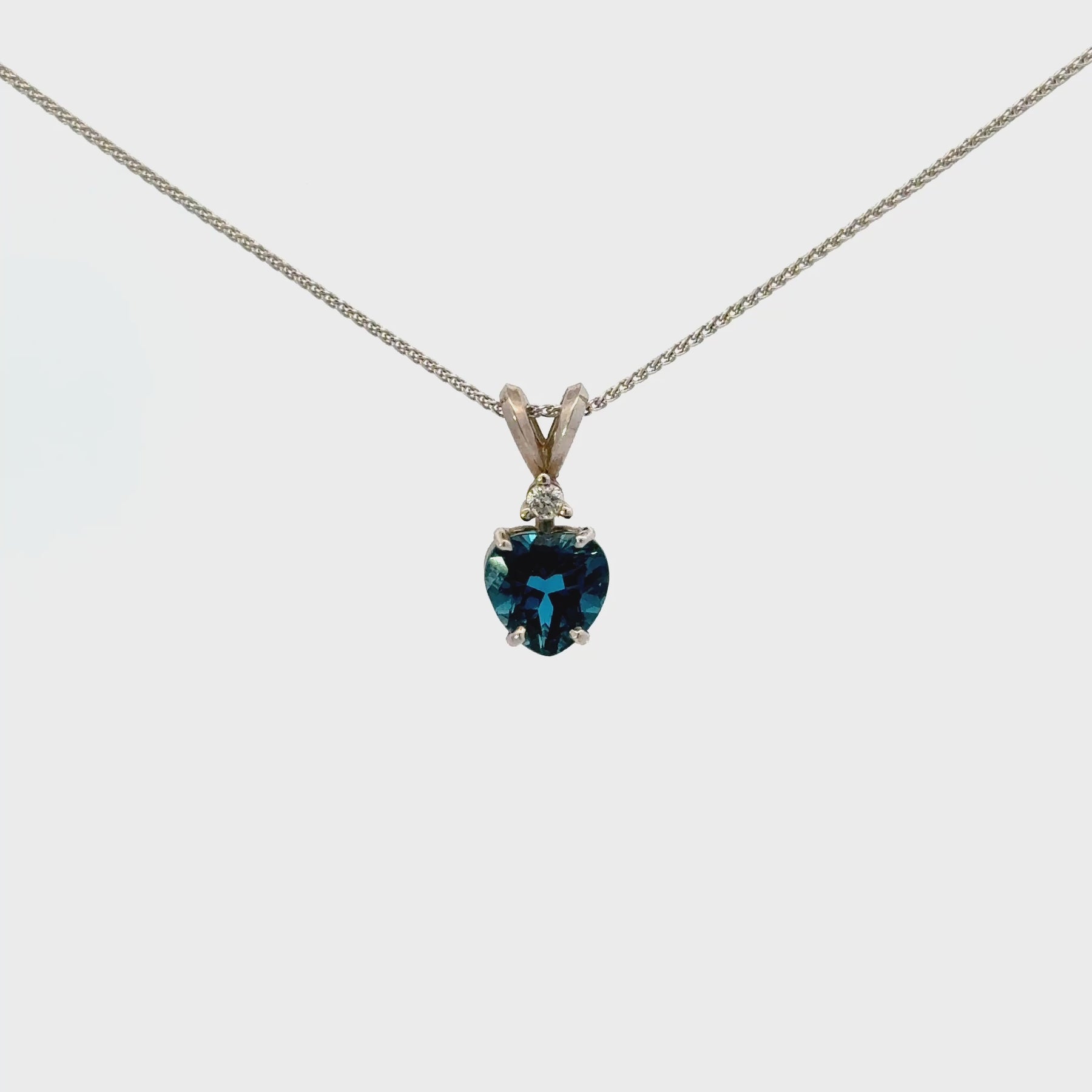 This necklace features a heart-cut London Blue Topaz set in 14K White Gold, accented by a round Diamond weighing approximately 0.03 carats. The London Blue Topaz, with an approximate total weight of 1.51 carats, displays a rich, deep blue hue with exceptional brilliance.