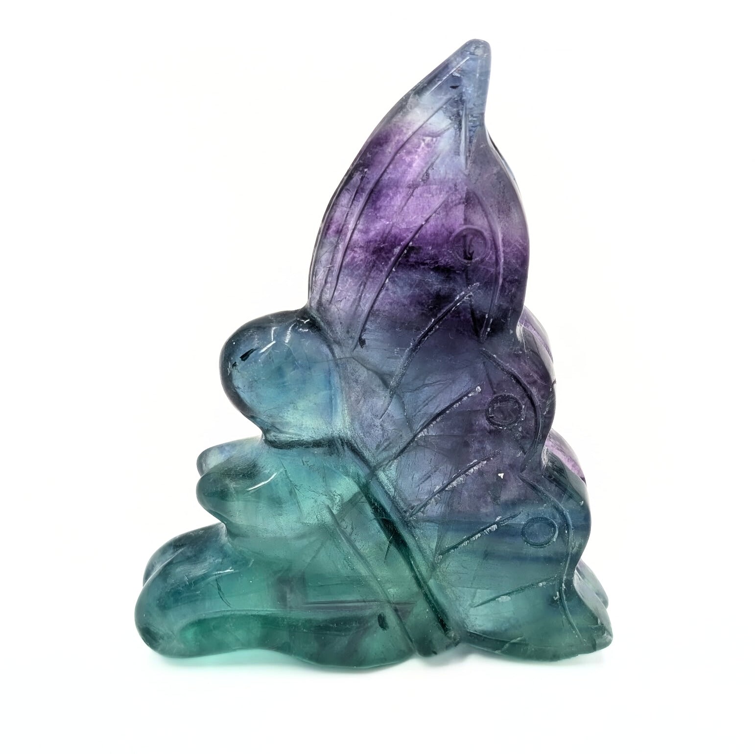 This enchanting fairy is carved from vibrant Rainbow Fluorite, displaying a stunning blend of violet, teal, and soft green hues with natural translucence. Polished to a gentle sheen, the carving highlights the stone’s layered bands and ethereal glow. Rainbow Fluorite is celebrated for promoting clarity, balance, and spiritual harmony making this piece as uplifting as it is beautiful.